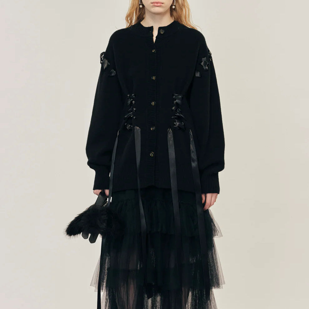 コルセット風のデザインで、全体にサテンリボンのディテールが施されたカーディガンです。ボリュームのある袖とオーバーサイズのシルエットが、リボンのレースでドラマチックな立体感を演出します。