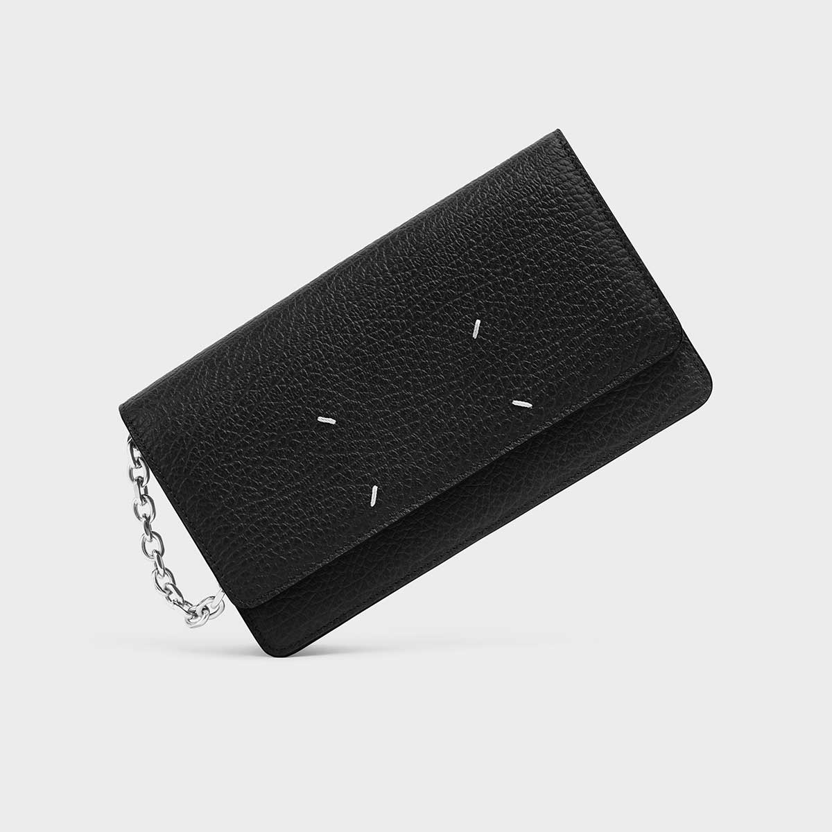 エンボス加工が施されたグレイニーレザー製のウォレットです。チェーンが付いています。スナップボタンクロージャーと紙幣を収納するセクションが備わっています。