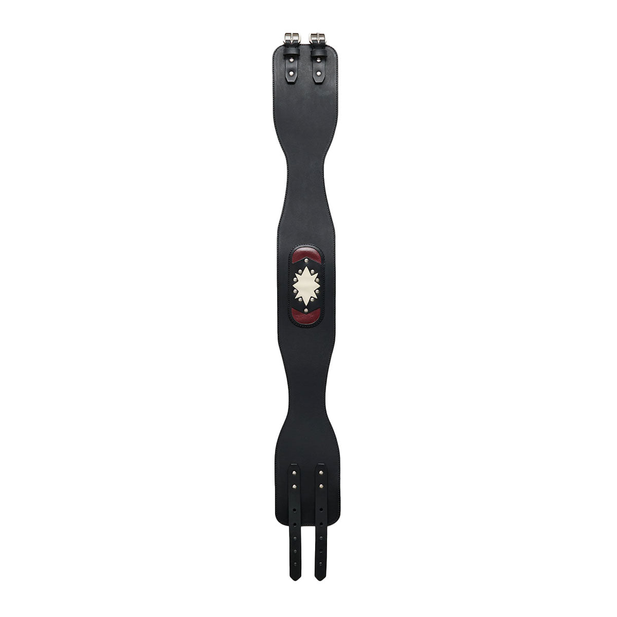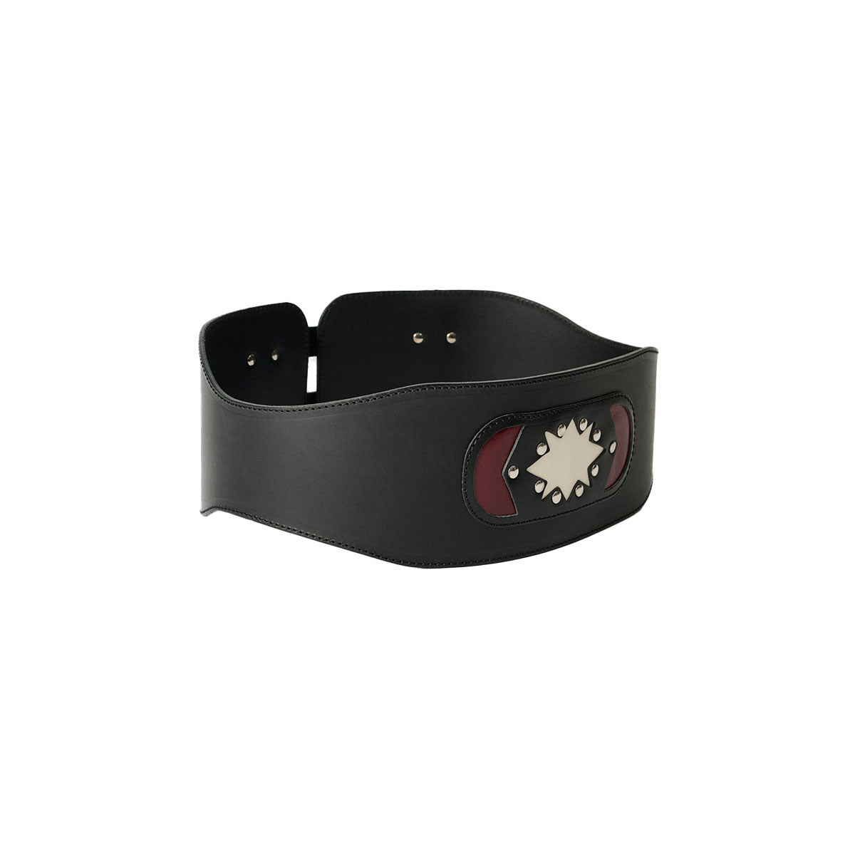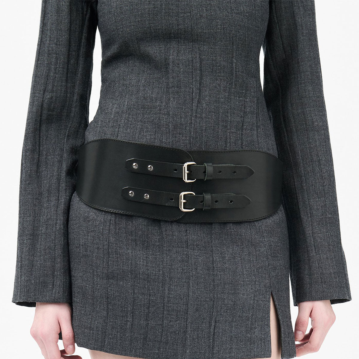 滑らかな表面と柔らかな光沢仕上げのイタリア産ベジタブルタンニンなめし牛革を使用し、ステッチエッジのシェイプデザイン、メタルバックル付きのダブルストラップ、そして背面中央のスタッズカットアウトが特徴です。本物のガードルベルトをベースに、フロント中央に2つのバックル留めを備え、上部のバックルのみを留めればウエストまたはヒップに着用でき、フロント中央に角度のあるシルエットを演出します。