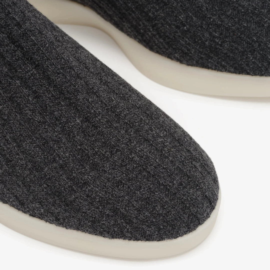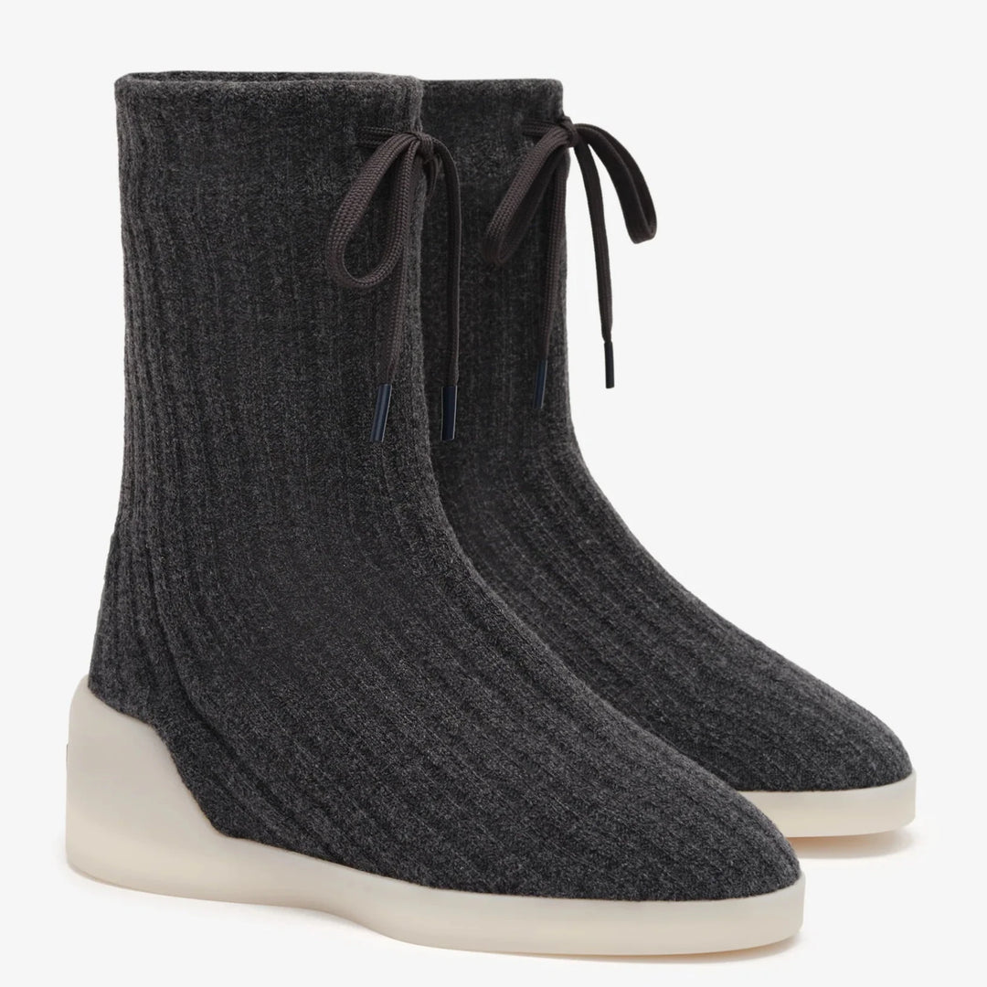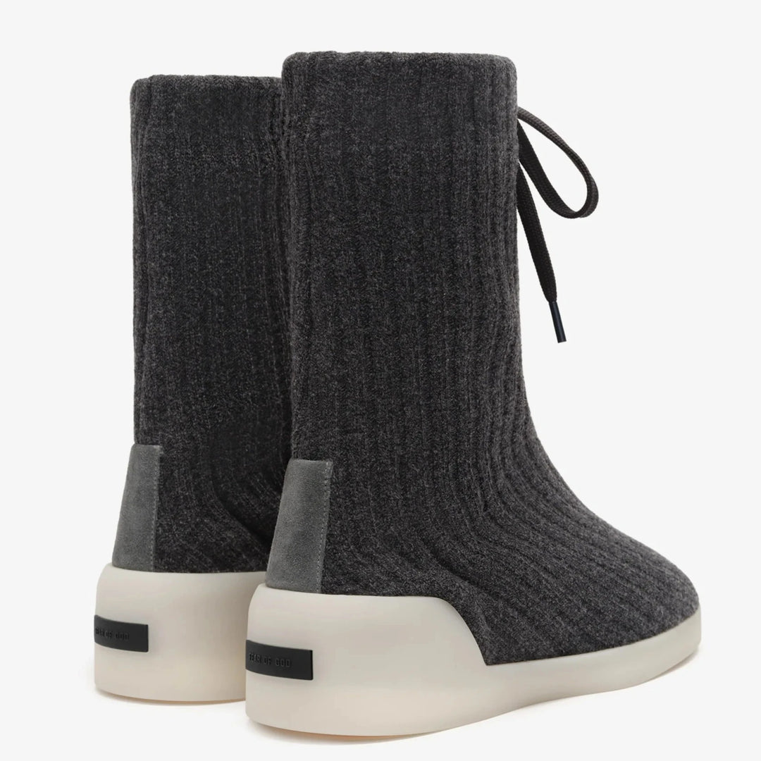 Mock Knit Highは、ウールのリブテクスチャで編まれたアッパーと、快適さを追求した全面ネオプレン裏地を備えたスリップオンスタイルの靴です。ネイティブアメリカンにインスパイアされたデザインを、ラバー製のスニーカーアウトソールで再解釈しており、靴下のようなアッパーは圧縮して形を変えることができます。調節可能なトップレース、スエードヒールタブ、そしてヒールにはFear of Godのブラックバーレーベルが施されています。