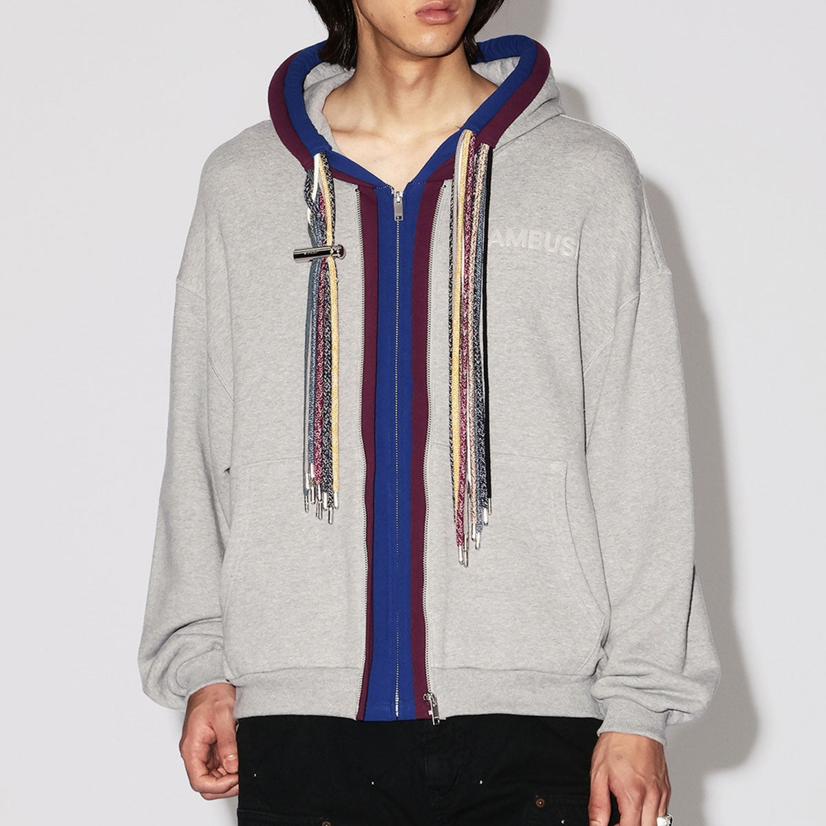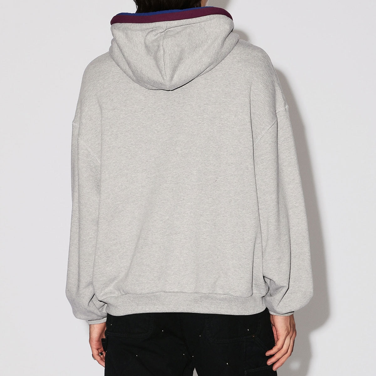 フードにあしらったマルチカラーコードが、動きとリズムをもたらすジップアップフーディです。 センターの配色切り替えが構築的なラインを生み、スタイリングに映える佇まいに。 ベーシックなシルエットに遊びを効かせた、AMBSUH®ならではの一着。