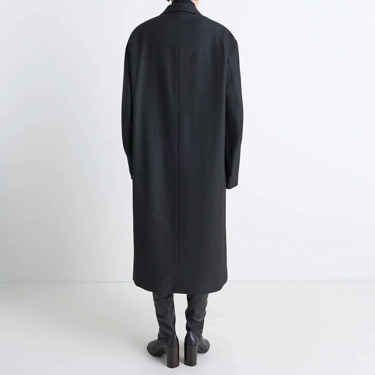 このしなやかなロング丈のチェスターフィールドコートは、軽やかなカシミア混紡素材で仕立てられています。オーバーサイズのカットは衣服の脱構築であり、伝統的なテーラーの世界観を再解釈し、ルメールならではの唯一無二のエレガンスへのアプローチを体現しています。