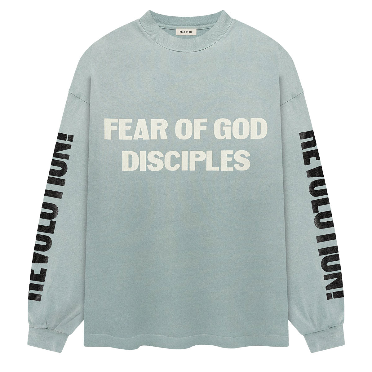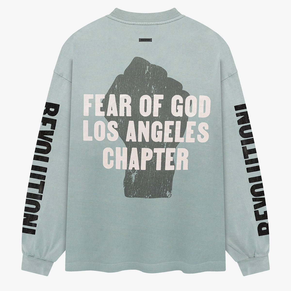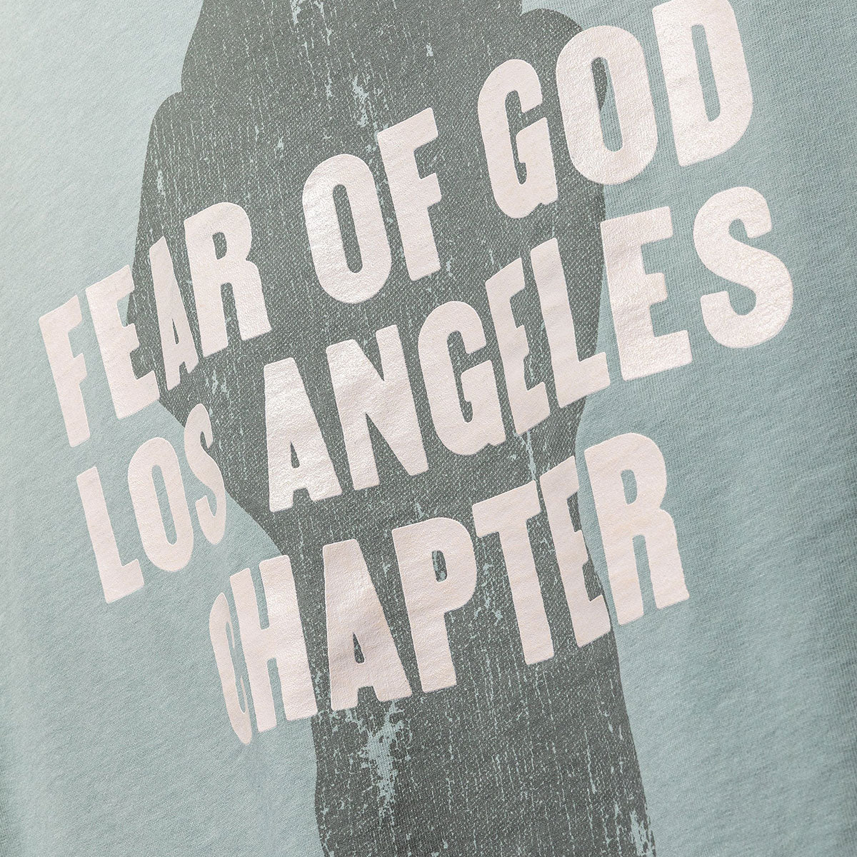 アメリカで仕立てられた100%ヘビーウェイトコットンジャージー素材。ガーメントウォッシュ加工とサンフェード加工が施され、本物のヴィンテージ感を醸し出しています。ハンドプリントのグラフィックは、公民権運動時代にインスパイアされています。リブニットのクルーネックTシャツは、ドロップショルダーのリラックスフィットで、後ろ襟にはFear of Godのステッチラベルが施されています。