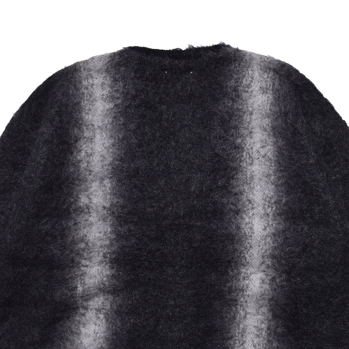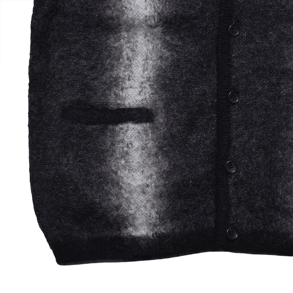 キッドモヘアとウールの混紡糸を用い、ヴィンテージのシャツからインスピレーションを受けた大胆なストライプ柄をジャガード編みで表現。 ウールよりも毛足が長く空気を多く含むため、軽くて保温性が高いのが特徴。 ややゆったりとしたシルエットのニットカーディガン。