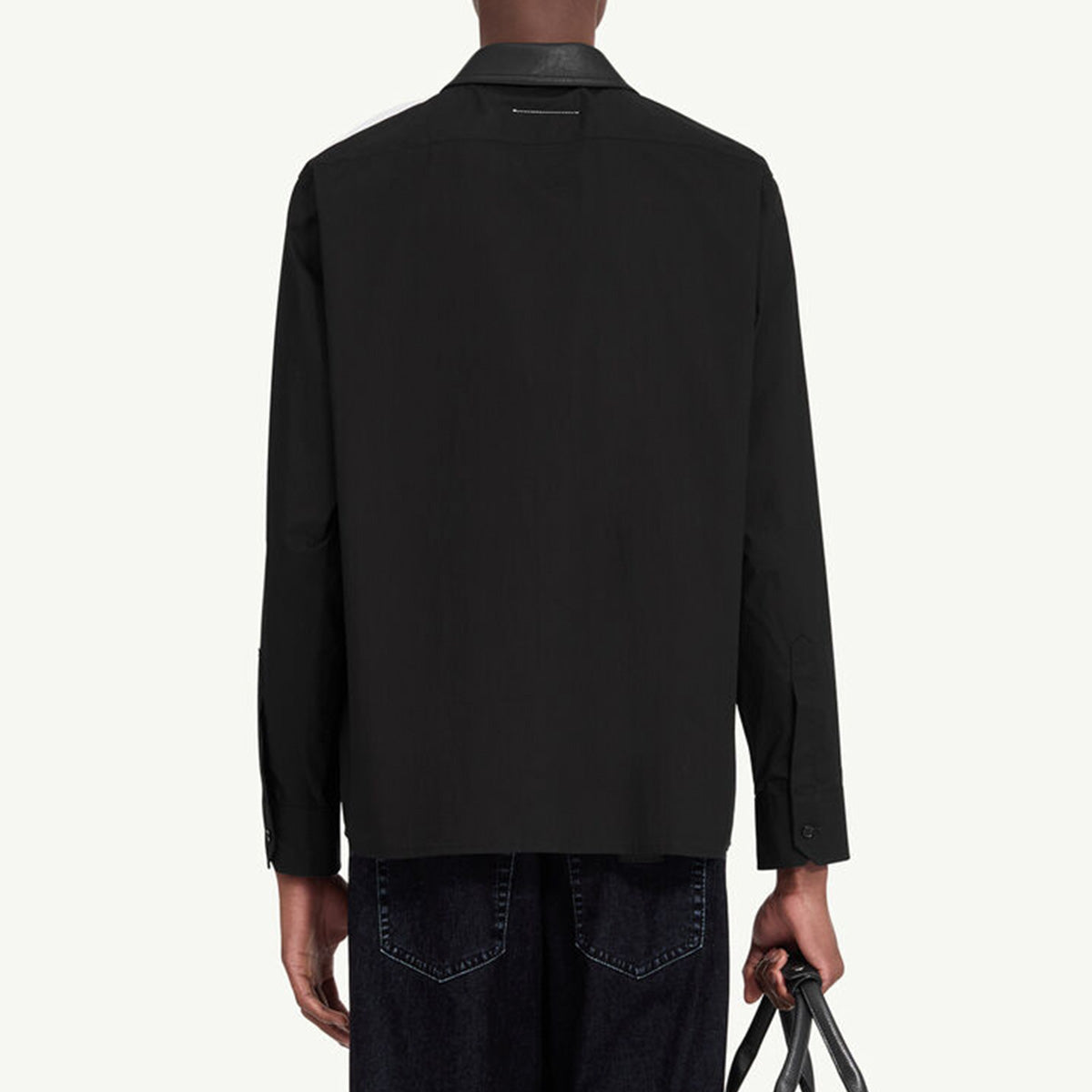 ジャケットの構造とシャツの気軽さを兼ね備えたテーラードシャツ。フロントを縁取るレザー調のパネルがコントラストを織りなしています。ノッチドラペルカラーとシングルブレストの開閉スタイルは、メゾンの飽くなき探求心を反映しています。