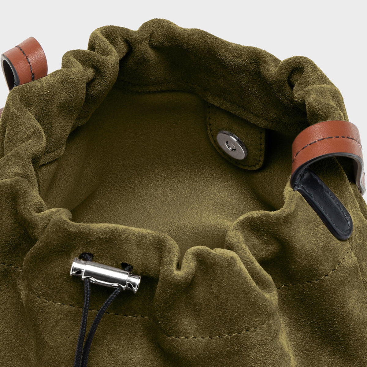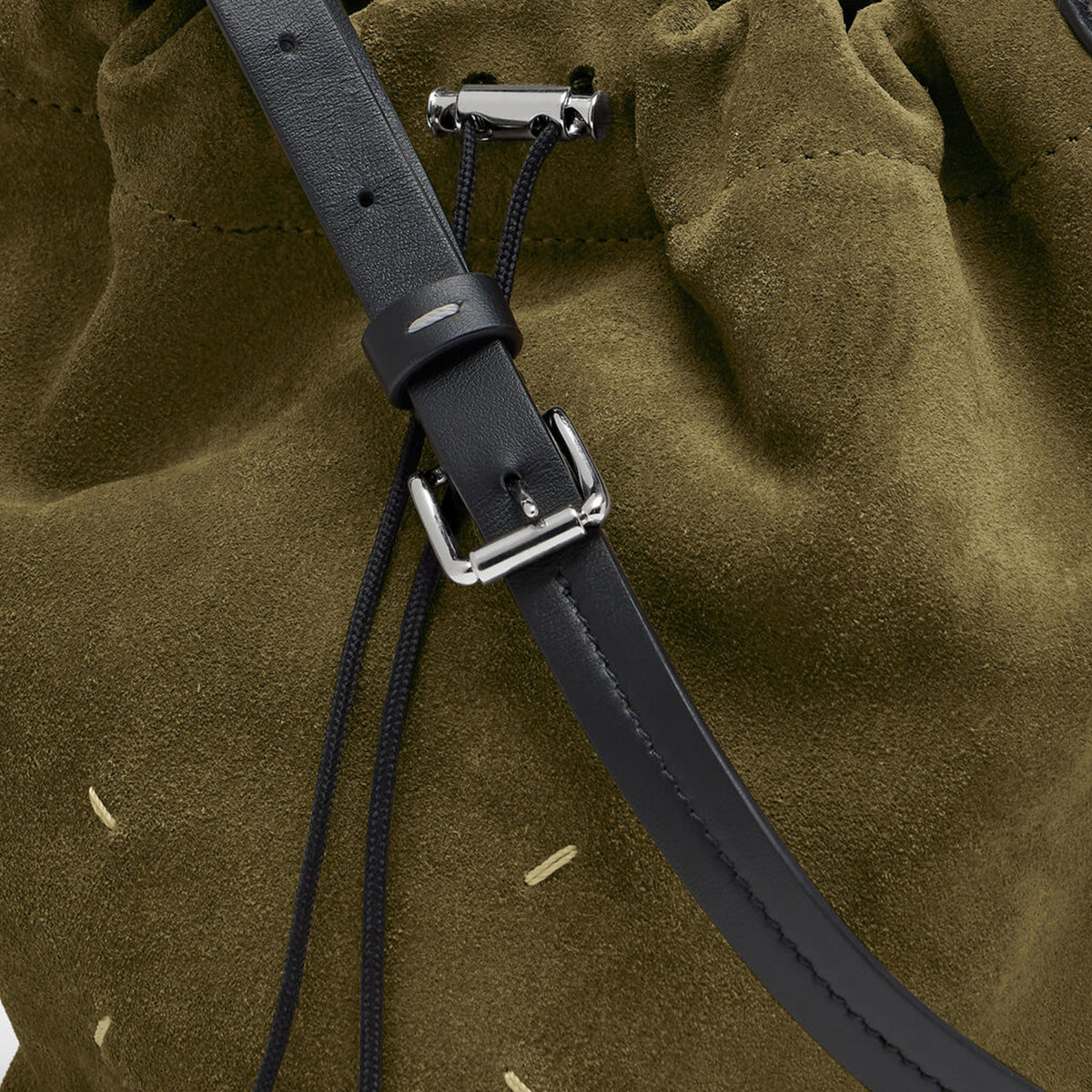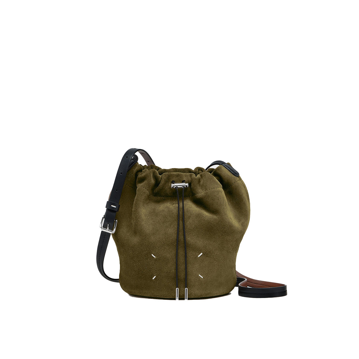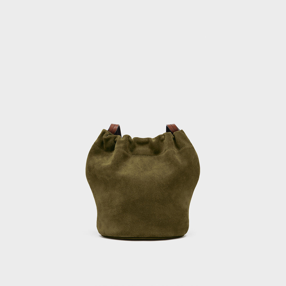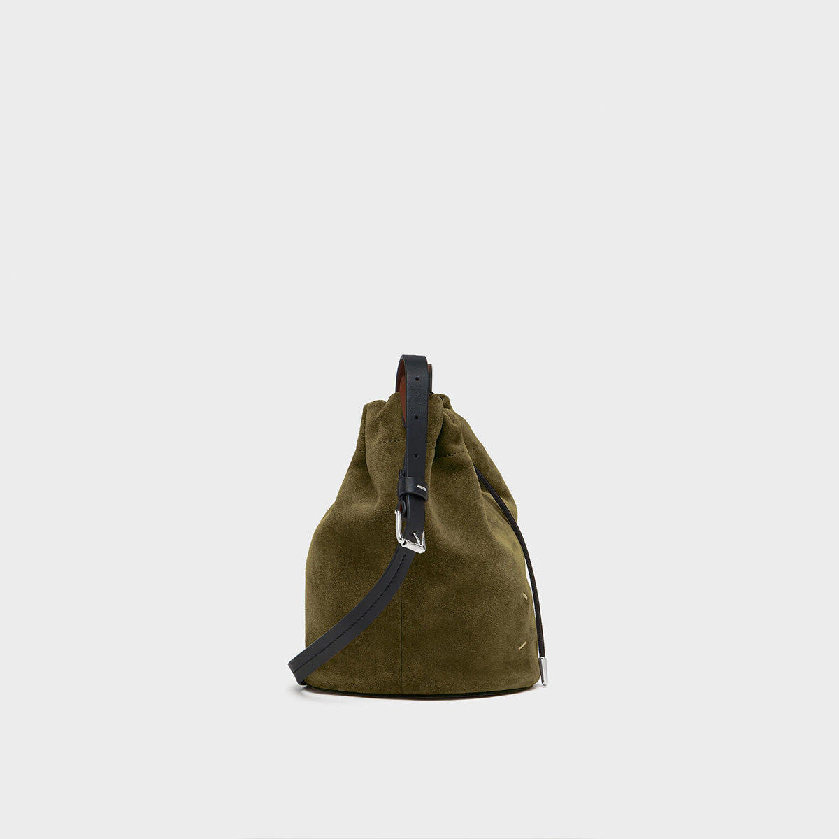 カジュアルなフォルムを洗練された表現に昇華したバケットバッグ。スエードで構築された彫刻的なシルエットが特徴で、ドローストリングクロージャーで開閉し、コントラストの効いたベルト風ショルダーストラップは調整可能。クロスボディ、ショルダーの両方で楽しめます。