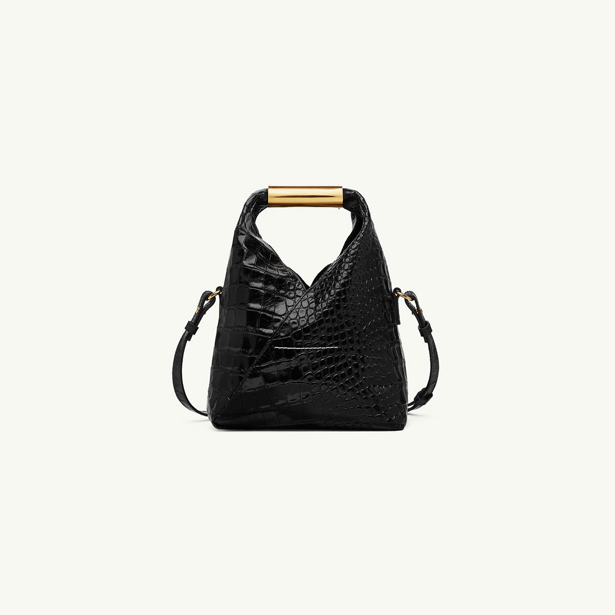 2024年春夏に初登場した、MM6を象徴するアクセサリー「ジャパニーズ」バッグの進化形。折り紙に着想を得た特徴的なフォルムを継承しつつ、構築的で新しい立体感を備えています。クロコ型押しのレザーを使用し、調節可能なストラップとハンドル部分の「ニューメリック」ロゴを配したデザインです。