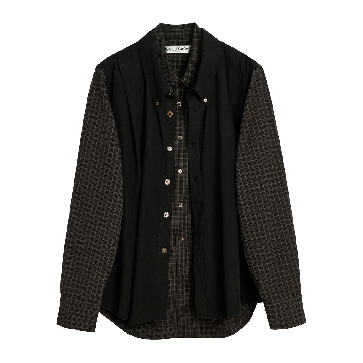 - ブラウンのチェック柄ベースにブラックのベストを重ね着