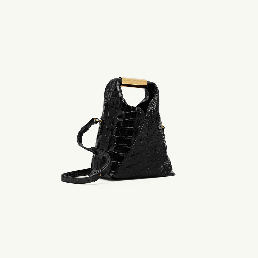 2024年春夏に初登場した、MM6を象徴するアクセサリー「ジャパニーズ」バッグの進化形。折り紙に着想を得た特徴的なフォルムを継承しつつ、構築的で新しい立体感を備えています。クロコ型押しのレザーを使用し、調節可能なストラップとハンドル部分の「ニューメリック」ロゴを配したデザインです。