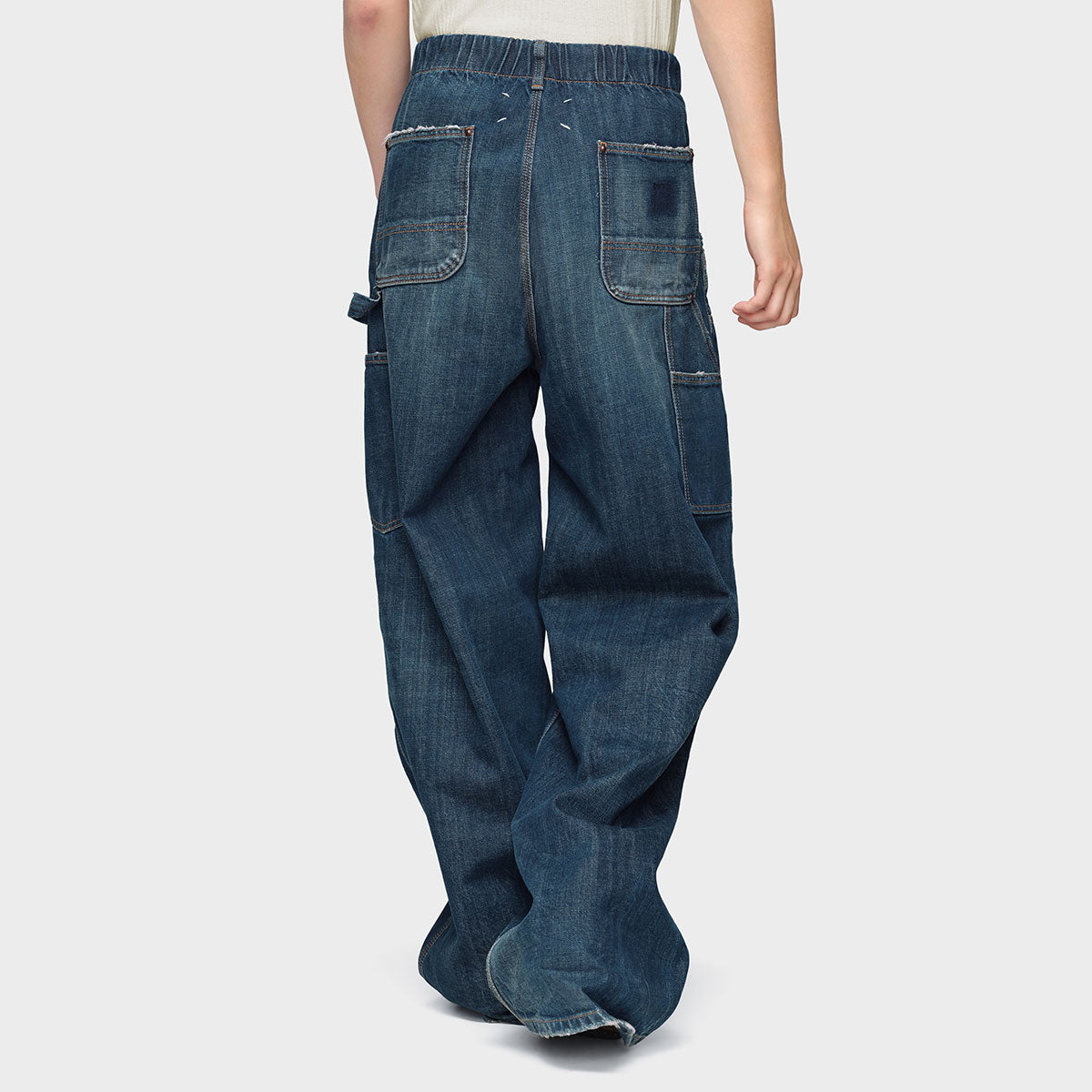 アーカイブのワークウェアをモチーフにしたワイドレッグジーンズ。スケール感を強調し、着用感を際立たせることで柔らかさをプラス。オーバーサイズのポケットと補強されたステッチラインが機能性を物語り、パッチワークと切りっぱなしのディテールがさりげない不規則性を生み出しています。背面には、メゾンのシグネチャーである4本のステッチがあしらわれ、ラベルとは対照的なデザインとなっています。