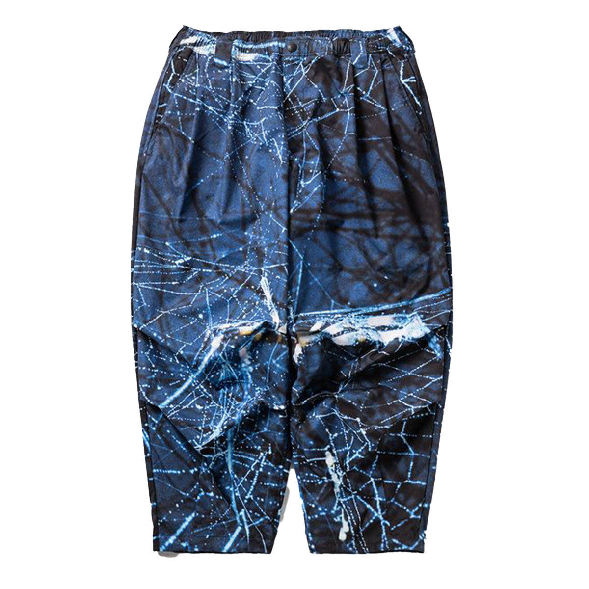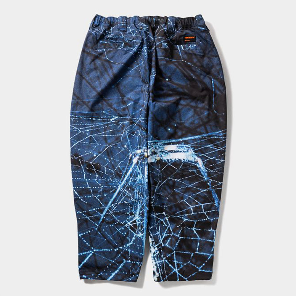 蜘蛛の写真を全面に昇華転写プリントしたトラックパンツ。 裾を狭め、膝のタックで立体感とゆとりをもたせたバルーンシルエット。 滑らかでマットな質感の表地に、サラっとしたメッシュの裏地付き。 スラッシュポケットとファスナー付きのサイドシームポケット、隠しマグネットボタ ン仕様のバックポケットを搭載。 ゴム入りのウエストバンドはベルトループと内出しのスピンドルコード付き。 裾にはドローコード入りでシルエット調整が可能。 バックの右腰部分にはロゴ入りパッチ付きで、コードロックやボタン、コードエンド にはロゴプリン ト入り。