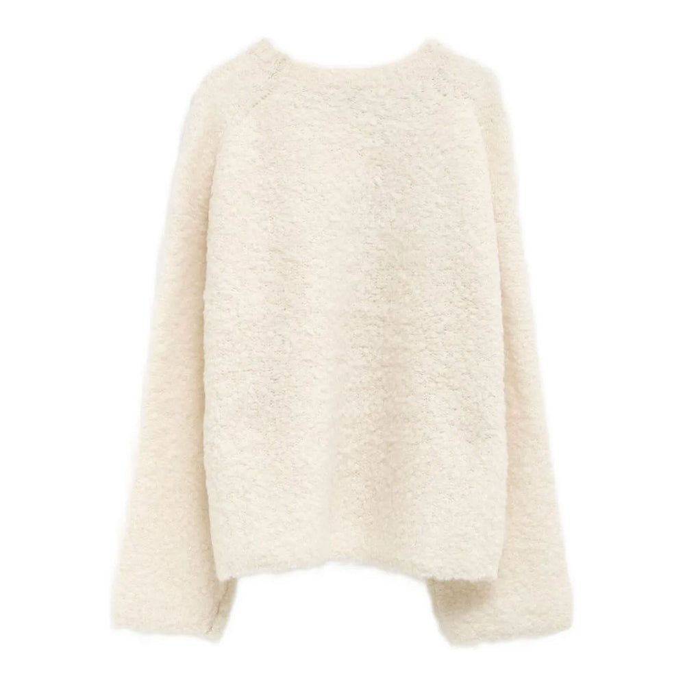 ふわふわでカールしたアルパカ混ブークレニットを、柔らかなテディベアのような風合いに仕上げたシグネチャー「TOTEME」セーター。ドラマチックなボックスシルエットに、オーバーサイズのボリュームと長めの袖丈が特徴です。