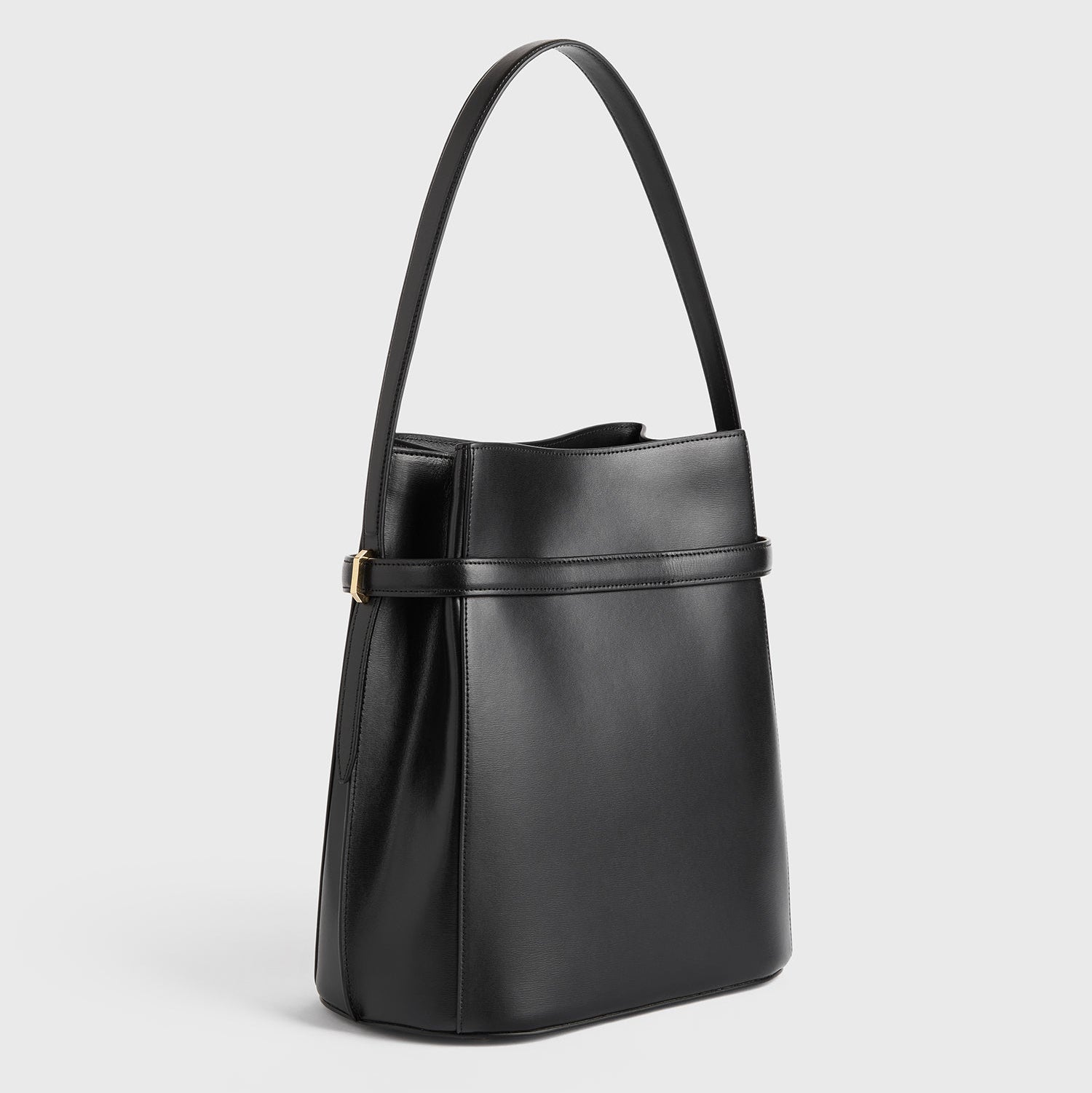 The new TOTEME bag features an elegant belt that can be used to tighten the flat bucket silhouette or open the slide clasp to expand the space. Crafted in Italy from soft, textured palmellatta leather, it's finished with gold-tone hardware. It features two interior slip pockets and a shoulder strap for versatile daytime carry.