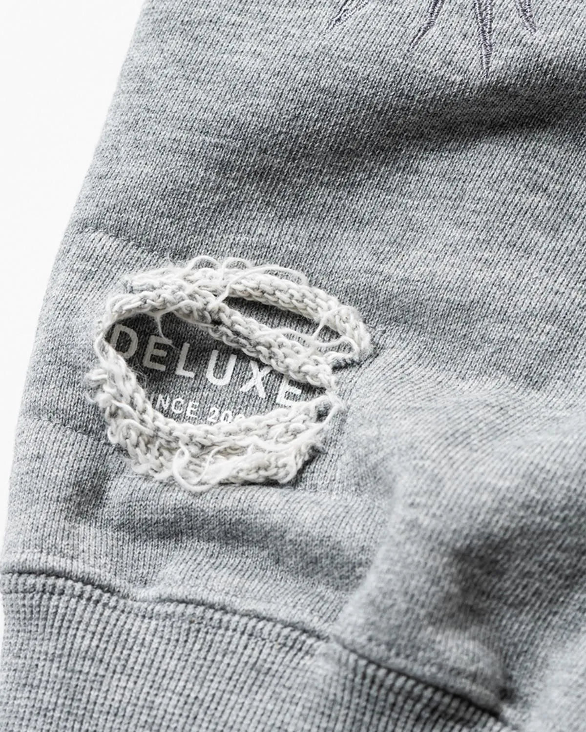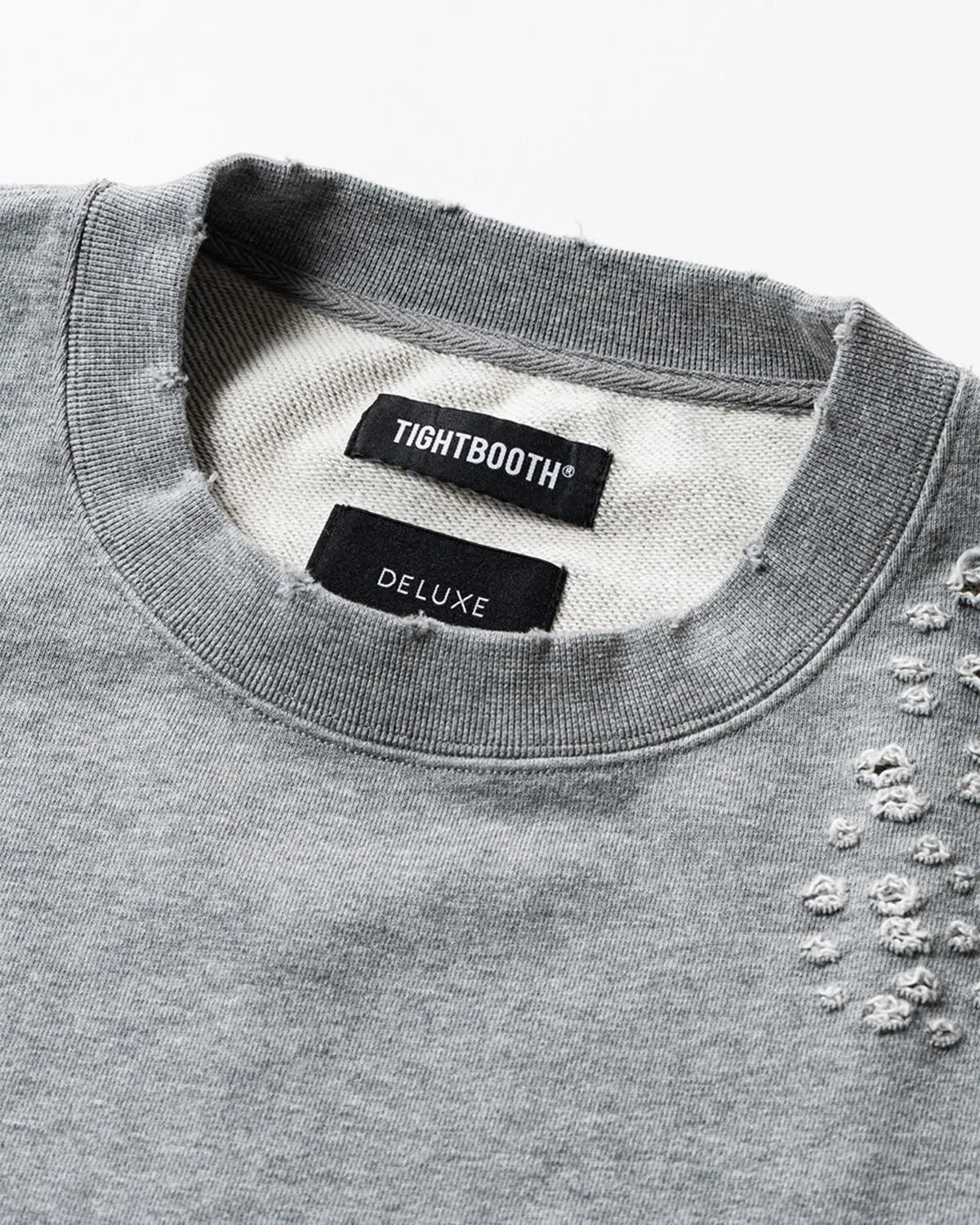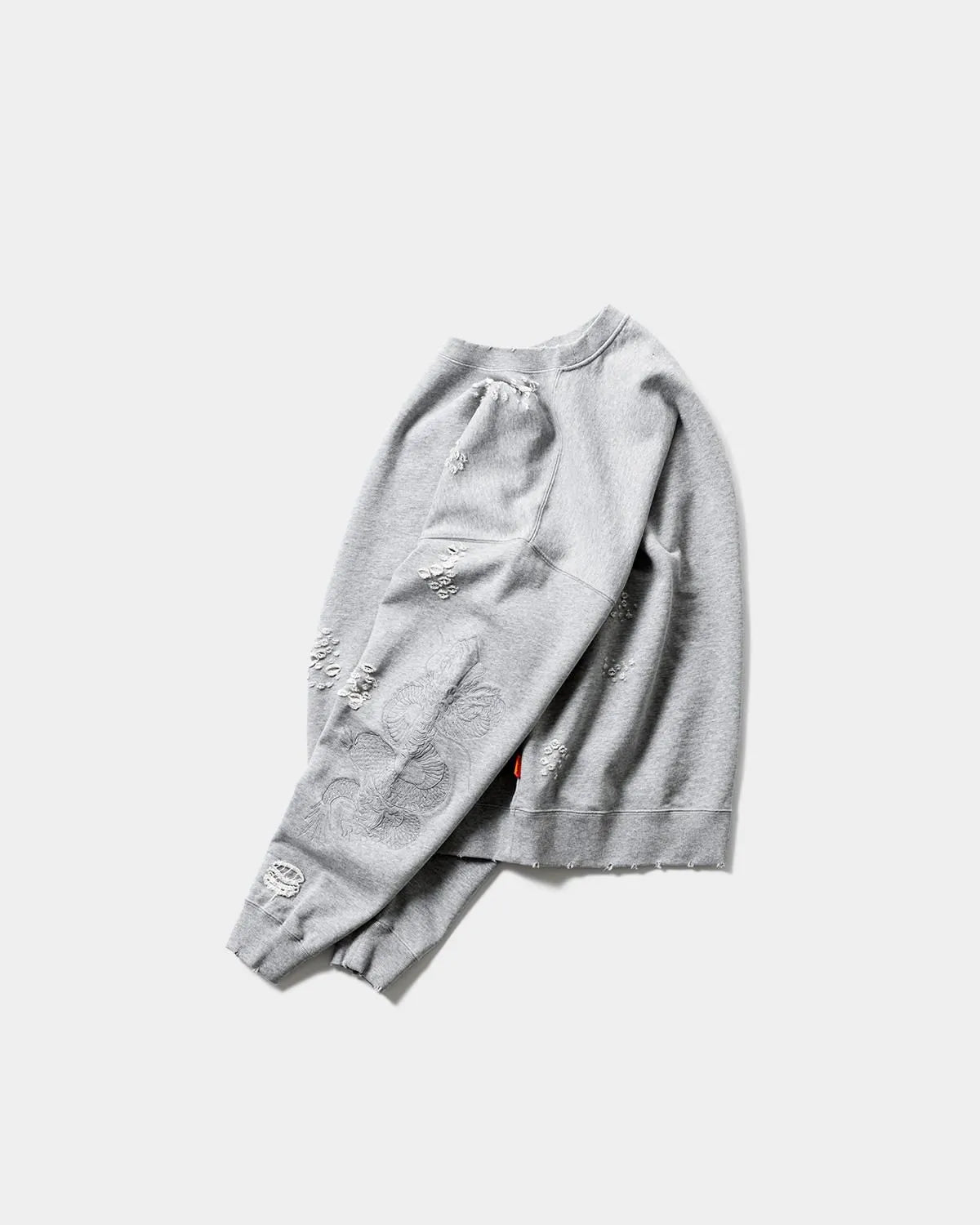 A collaboration item with DELUXE. A crew neck sweatshirt with an all-over distressed finish. Made from 14oz fleece cotton fabric that is thick and has just the right amount of firmness. The original dragon graphic embroidered on both arms features the TIGHTBOOTH logo on the right sleeve and the DELUXE logo on the left sleeve. The DELUXE logo is printed inside the damage hole on the left cuff and on the hem of the right side. Orange THIGHTBOOTH pin label on the bottom left seam. A smart, wide silhouette that provides ample room in the chest while maintaining a beautiful wearing line.