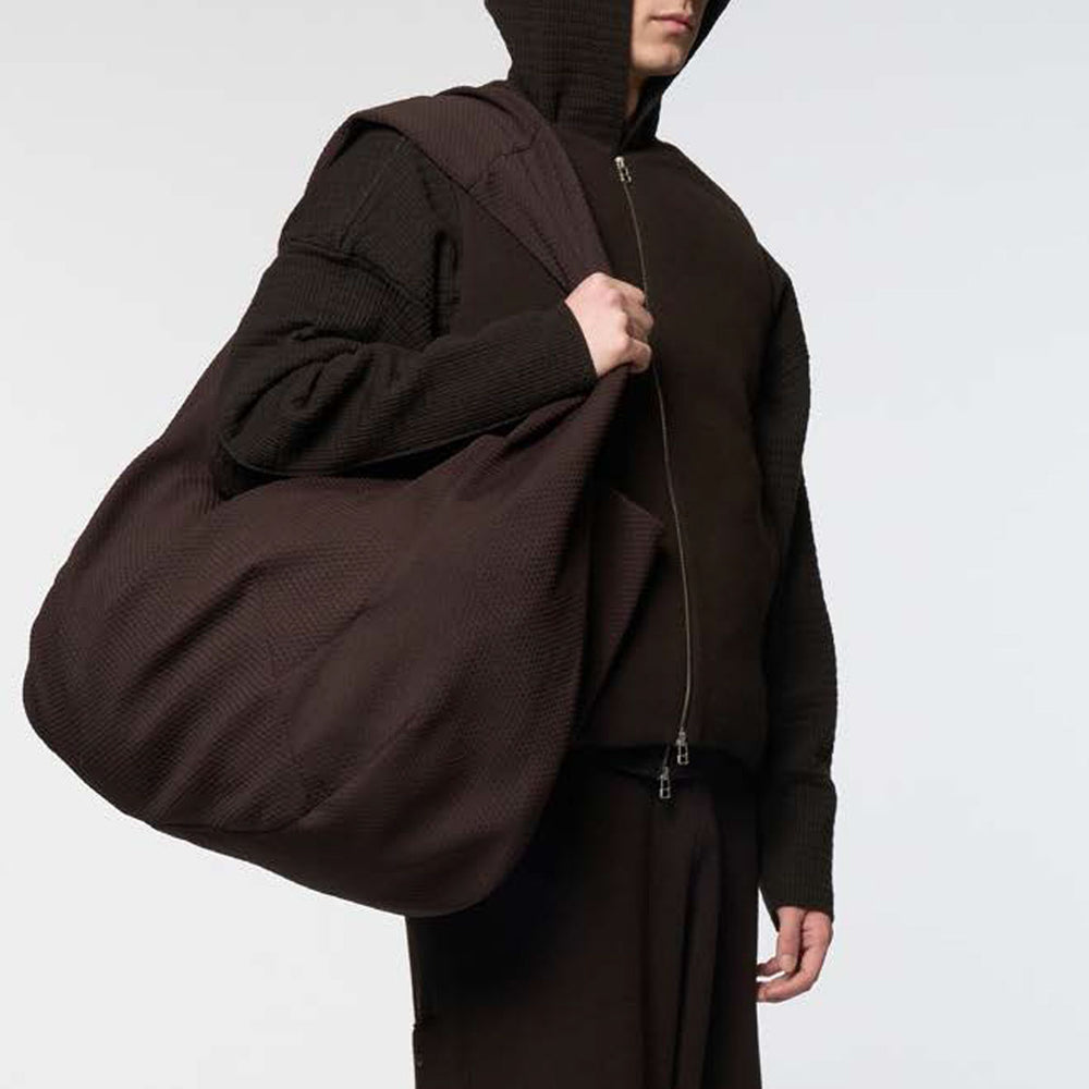 This is a crossbody bag made of checkered jacquard fabric. It's designed with a large capacity so that Omar Afredi's staff can actually store fabric and materials when visiting the factory. The darts on the outside create a rounded shape, adding structure to the bag.
