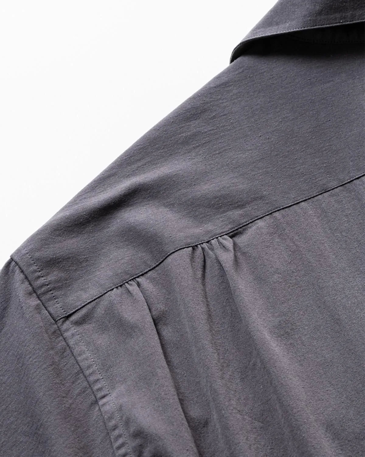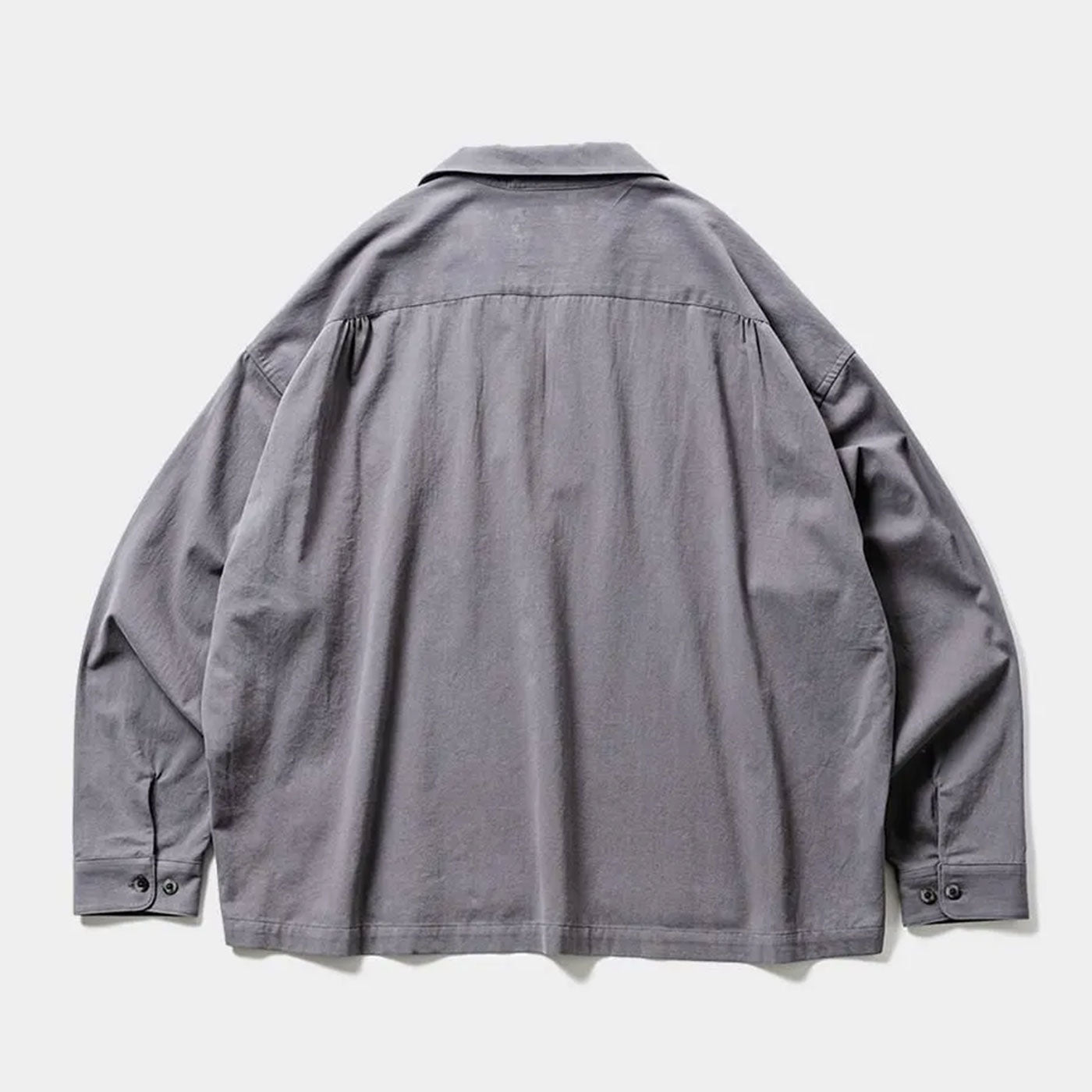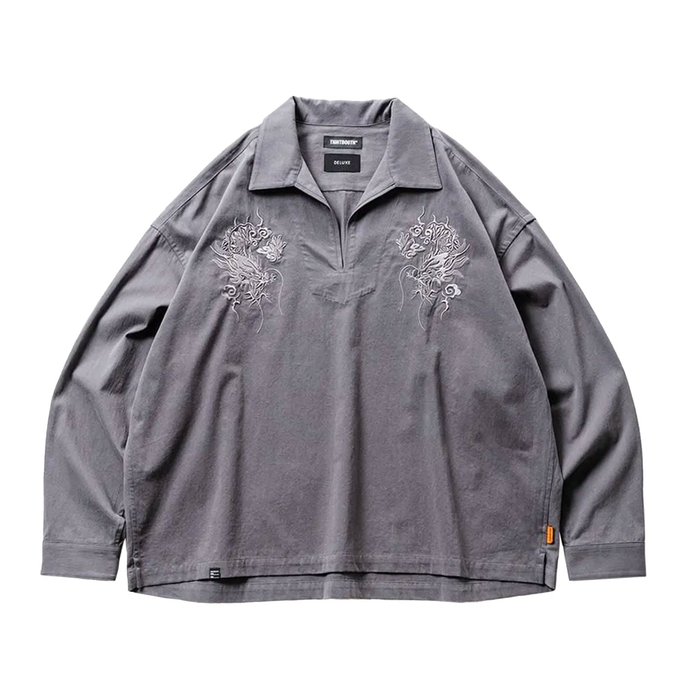 A collaboration item with DELUXE. Made from cotton flannel fabric that is just the right thickness and softness. Original design dragon embroidery on both front chests. The cuffs are "Ittekoi" style. The cufflinks are engraved with the logos of both brands. The gathers sandwiched in the yoke create a three-dimensional silhouette. There is an orange TIGHTBOOTH pin label on the bottom left seam and a DELUXE pin label on the right side of the hem.