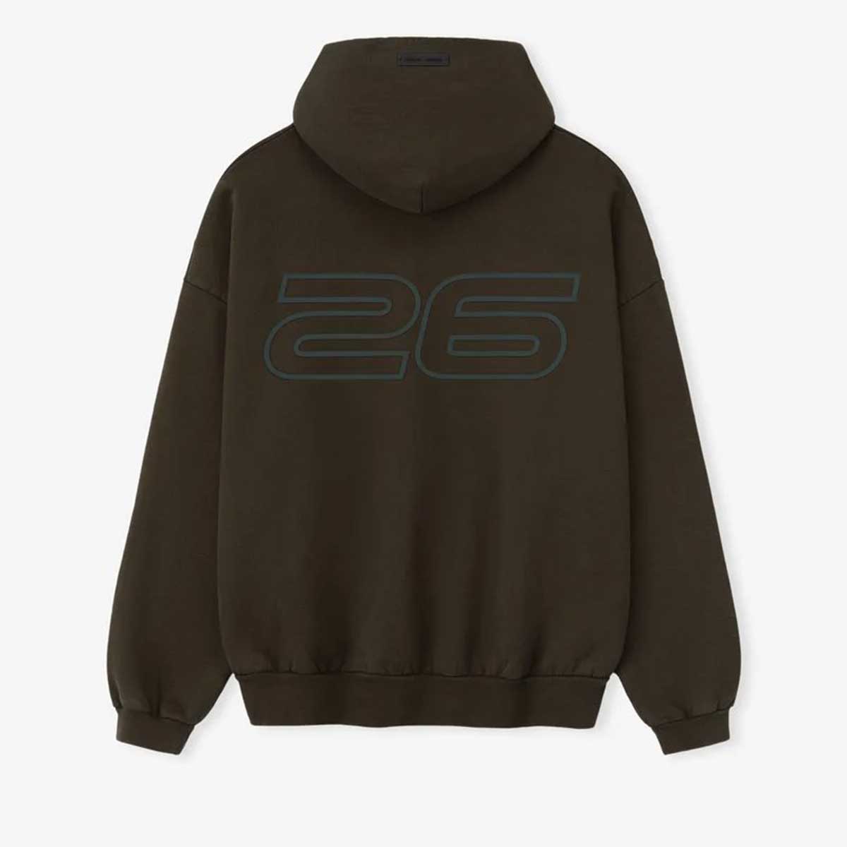 This heavy fleece hoodie is crafted from 520gsm heavy fleece and pigment-dyed for a rich, rich color. Its oversized, '90s-inspired silhouette features dropped shoulders for a relaxed drape and bold proportions. It features a "Fear of God Essentials" logo on the front and an HD-printed "26" graphic on the back.