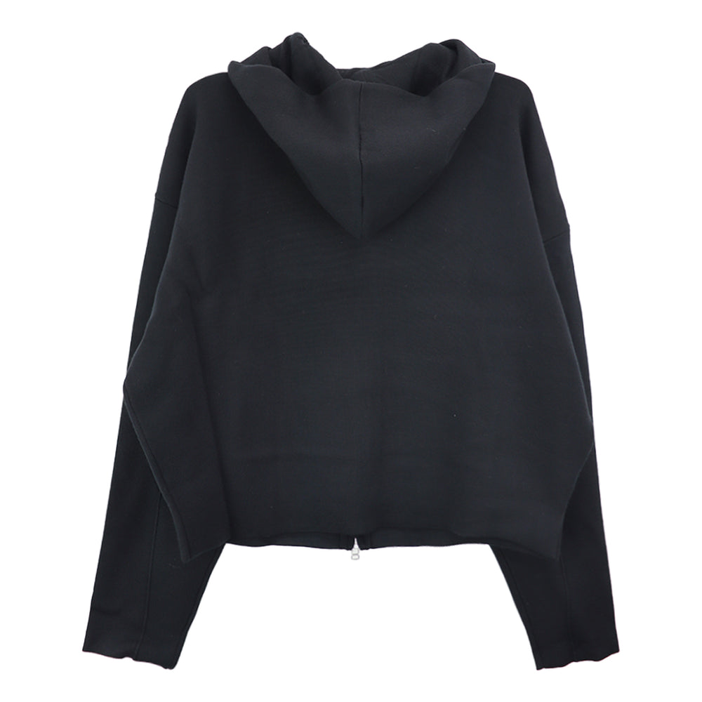 This new, relaxed-fit hoodie is made with two layers of 100% merino wool fine yarn, creating a bonded-like texture. The cuffs and waist are finished without ribbing, and the flat knit fabric continues from the sleeves to the body.