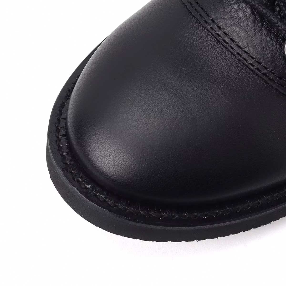 ソフトシュリンクレザーを使用したミリタリーブーツ。 アッパーは裏なしの一重のデザインで、筒を折り返して履けるように引っ掛けフックの仕様に仕上げています。
