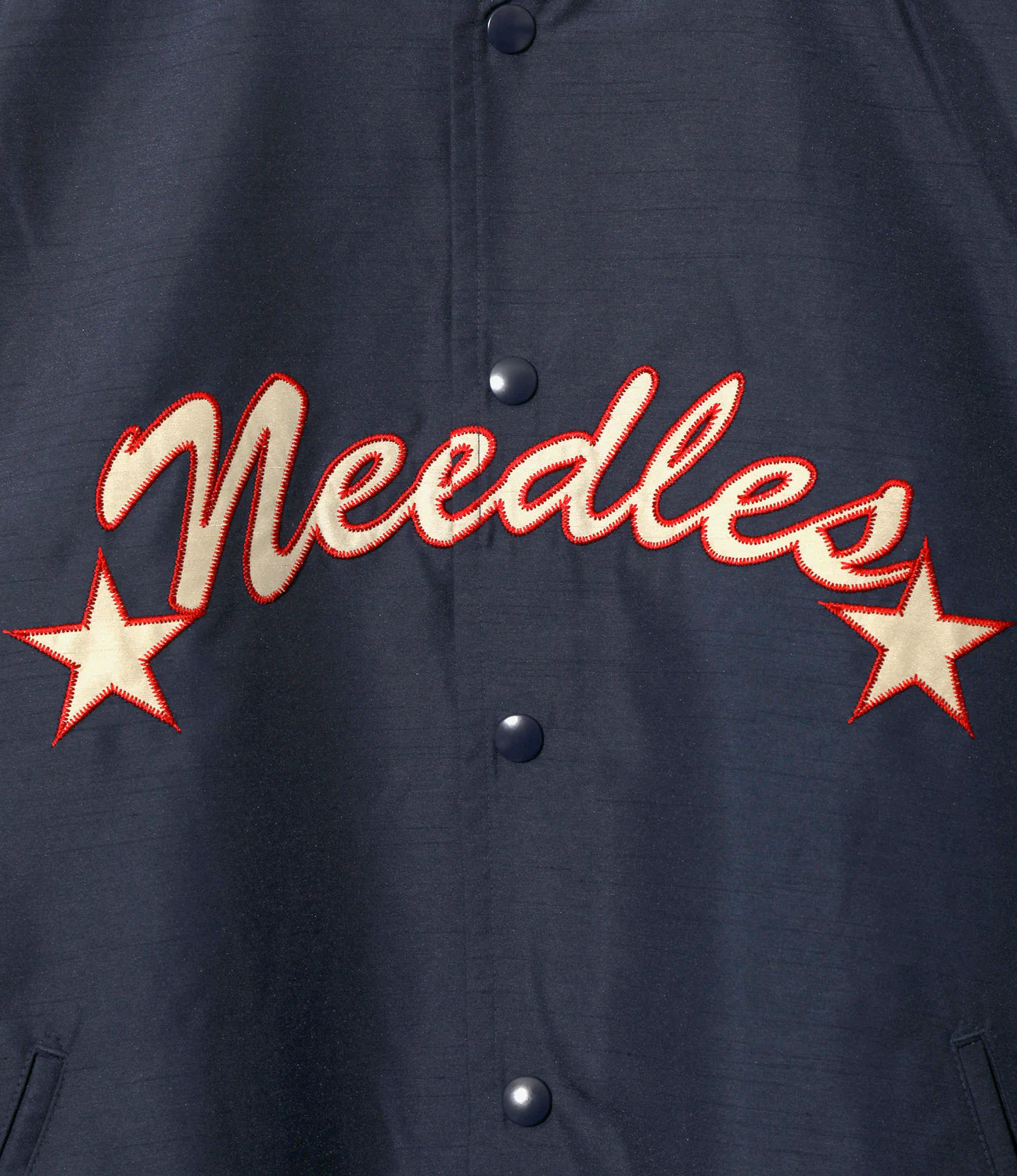 While retaining authentic details such as the striped ribs on the collar, cuffs, and hem, and the front snap buttons, this item utilizes a Poly Shantung material with an elegant sheen and slubs, giving it a light and stylish feel that differs from traditional stadium jackets. The PEACE symbol on the back, the papillon embroidery on the left sleeve, and the sleeves in different colors on the left and right sides create unique accents, making this a piece that combines sportiness with a playful spirit.