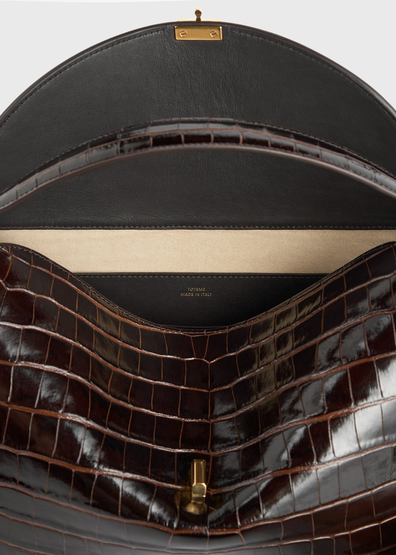 Perfect for everyday wear, the TOTEME bag features a curved flap that follows the contours of your arm. Crafted in Italy from crocodile-effect leather with a gold-tone metal T-lock, it features two interior slip pockets and can be carried by the top handle or the detachable, adjustable strap for versatile carrying options.