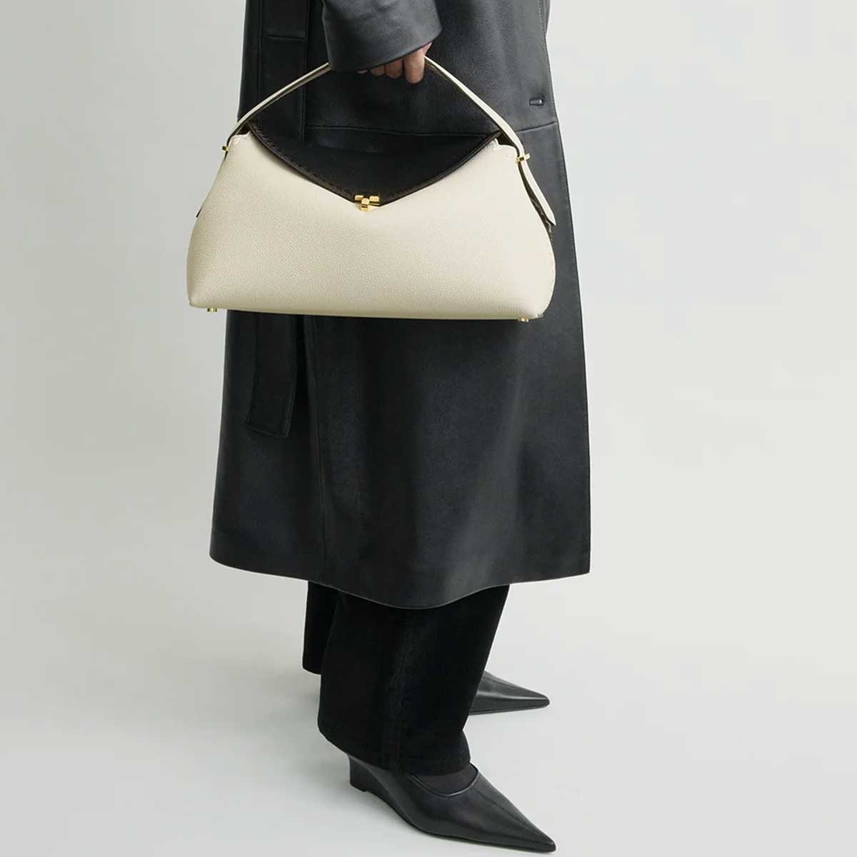 The classic T-lock top handle, named for its twisted fastening, is updated in monochrome. Crafted from smooth and grained leather and featuring signature blanket stitching, it's finished with gold-tone metal hardware and a microsuede lining. It features two interior slip pockets and can be carried by the top handle or the detachable, adjustable strap for versatile styling.