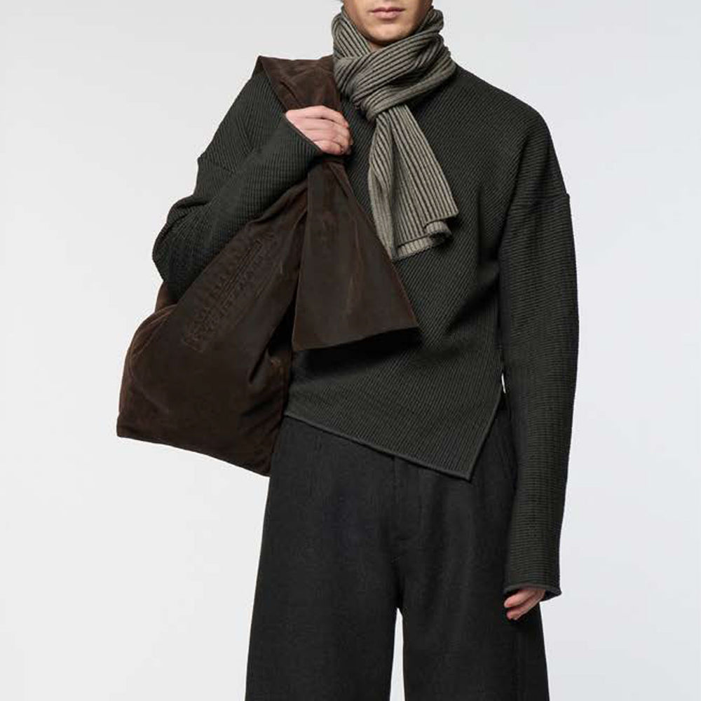 This classic style bag is characterized by the knot on the shoulder strap. Made from 100% cotton heavy denim with a flocked finish, it has a velvety sheen. The garment wash slightly wears away the flocking, creating a subtle faded effect. A pocket for small items is located on the front.