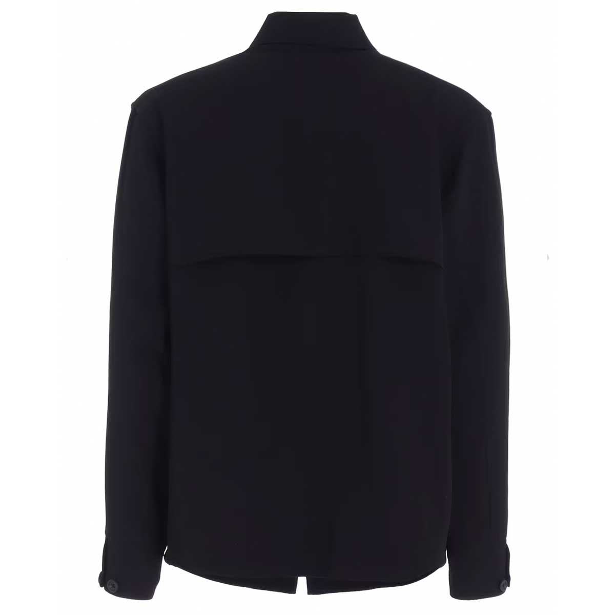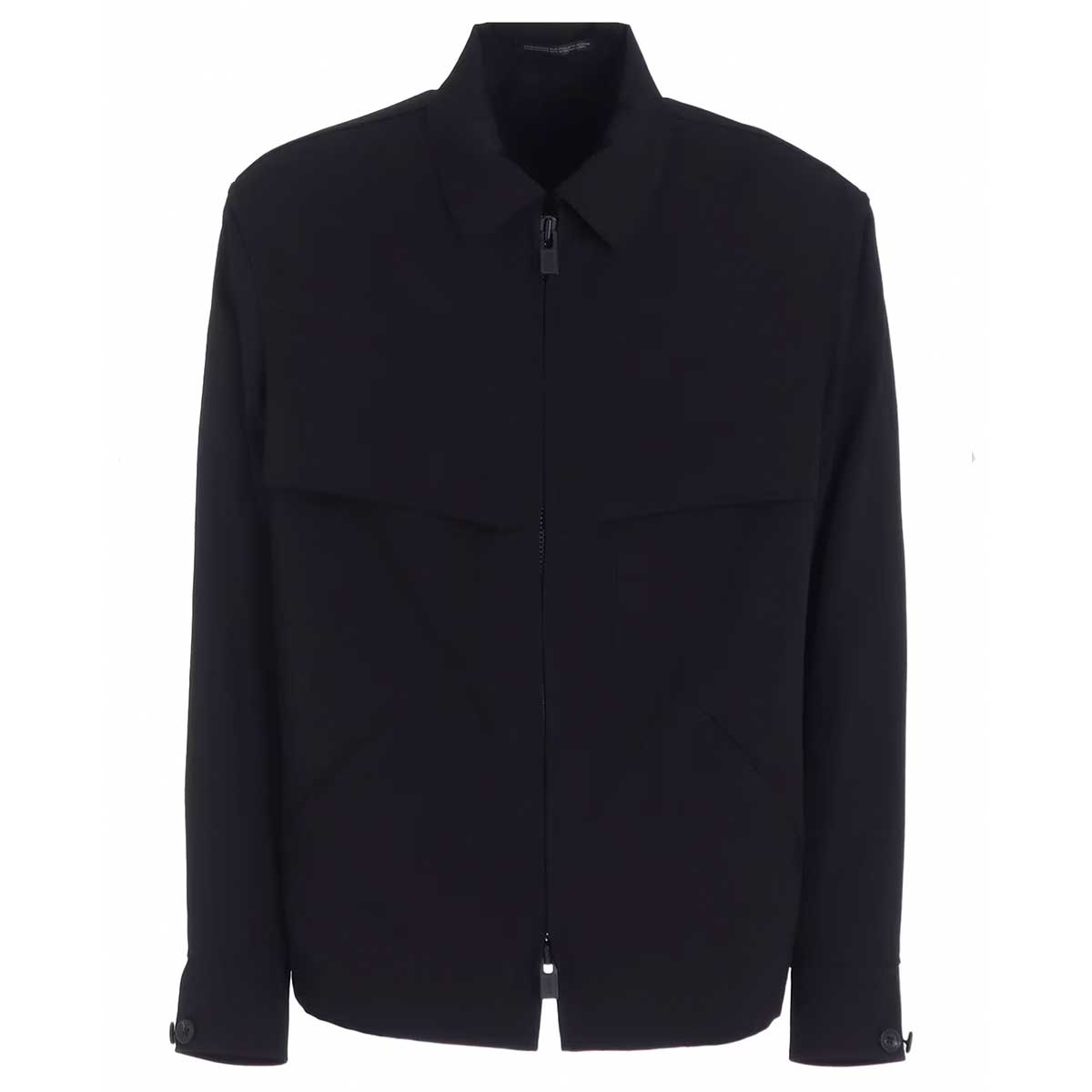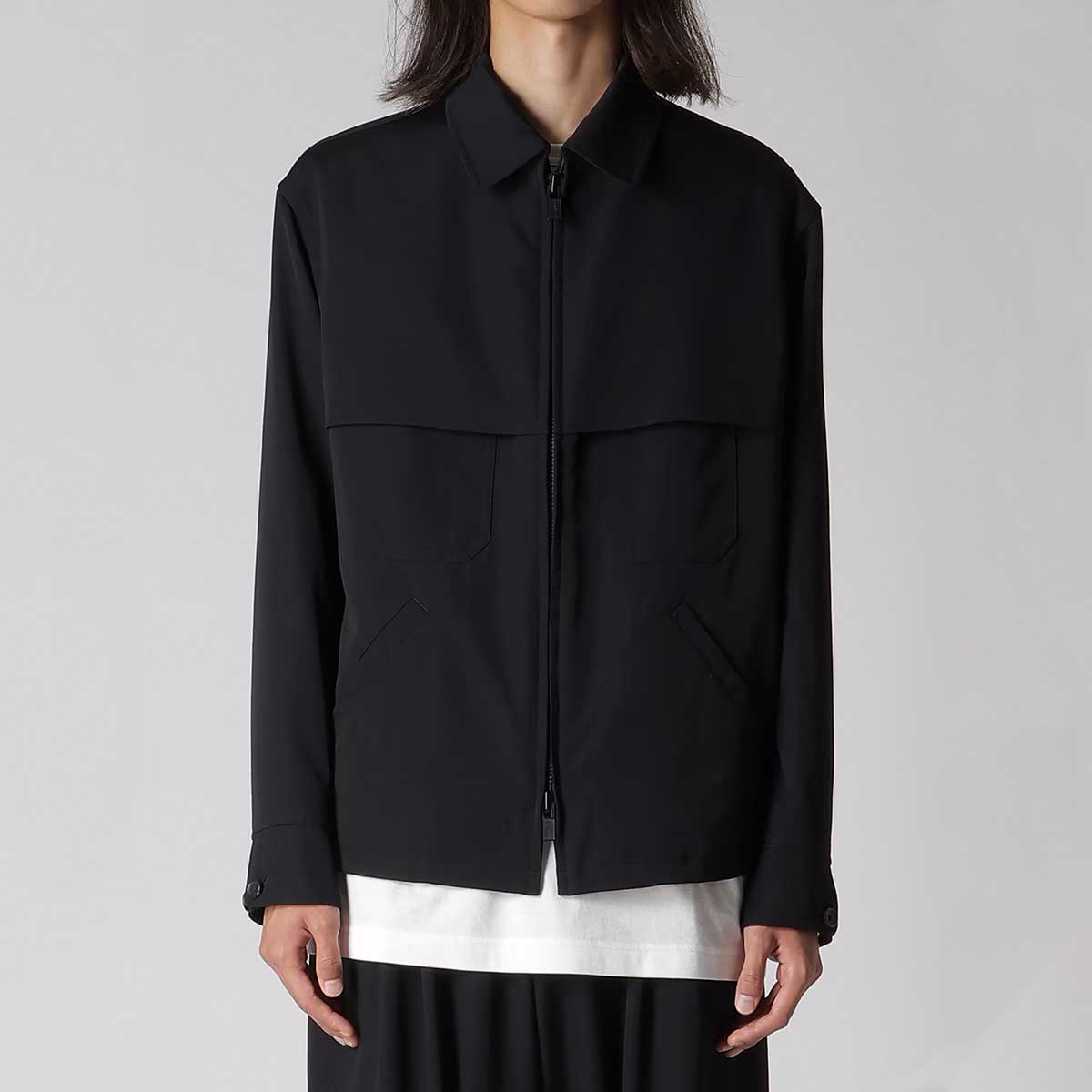 ウールギャバジンブルゾン。 生地は、仕上げの工程でセット性を弱くすることにより織物に軽くシワやシボを付け、ウール本来の風合いに仕上げたヨウジヤマモト社の定番素材であるウールギャバジンを使用しています。フロントからバックまでを覆うように配された雨除けフラップが、そのまま胸ポケットのフラップにもなったデザインブルゾン。カジュアルなスタイリングに良くマッチします。