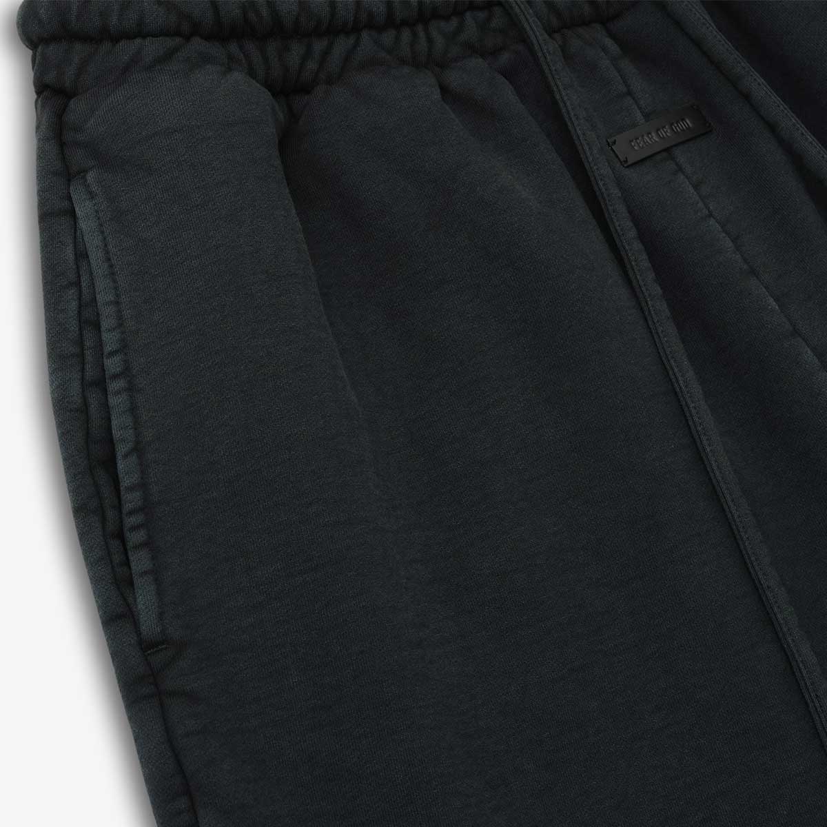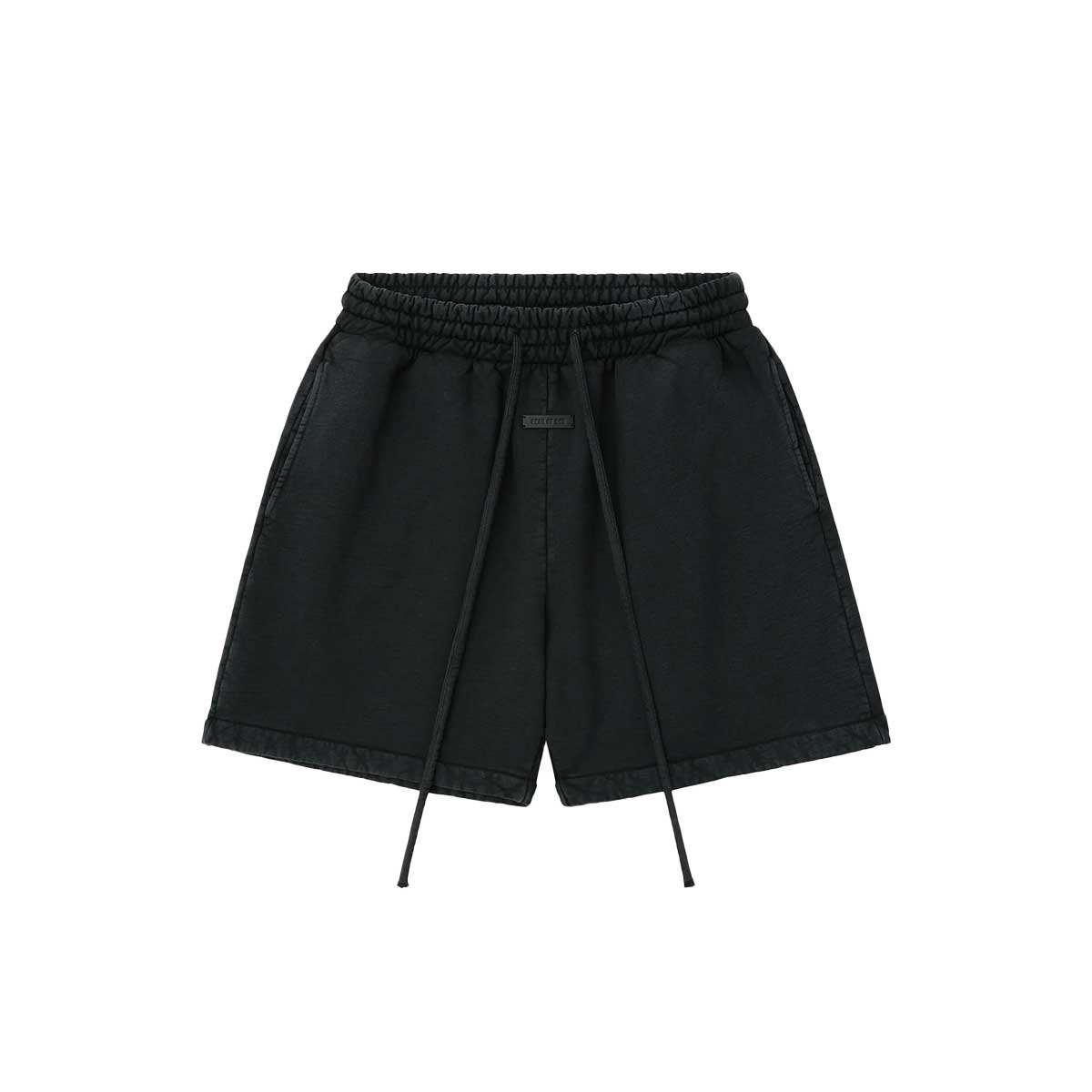 Made in the USA, these sports shorts are crafted from garment-dyed, brushed heavy cotton fleece, featuring an elastic waistband with a drawstring and side seam pockets. The iconic Fear of God 4-stitch label is prominently displayed at the center front.
