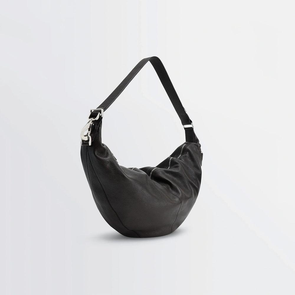 The unisex "Quiver Clip" line is inspired by the traditional quiver and is suitable for both day and night. This bag, which can be carried on the shoulder or crossbody, features a vegetable-tanned leather shoulder strap adjustable with a snap hook—a new metal piece specially designed by the Lemaire accessories studio. Made with thick, durable grain buffalo leather known for its textured feel and LWG Gold certified, this practical bag fits comfortably against the body, a hallmark of Lemaire accessories DNA.