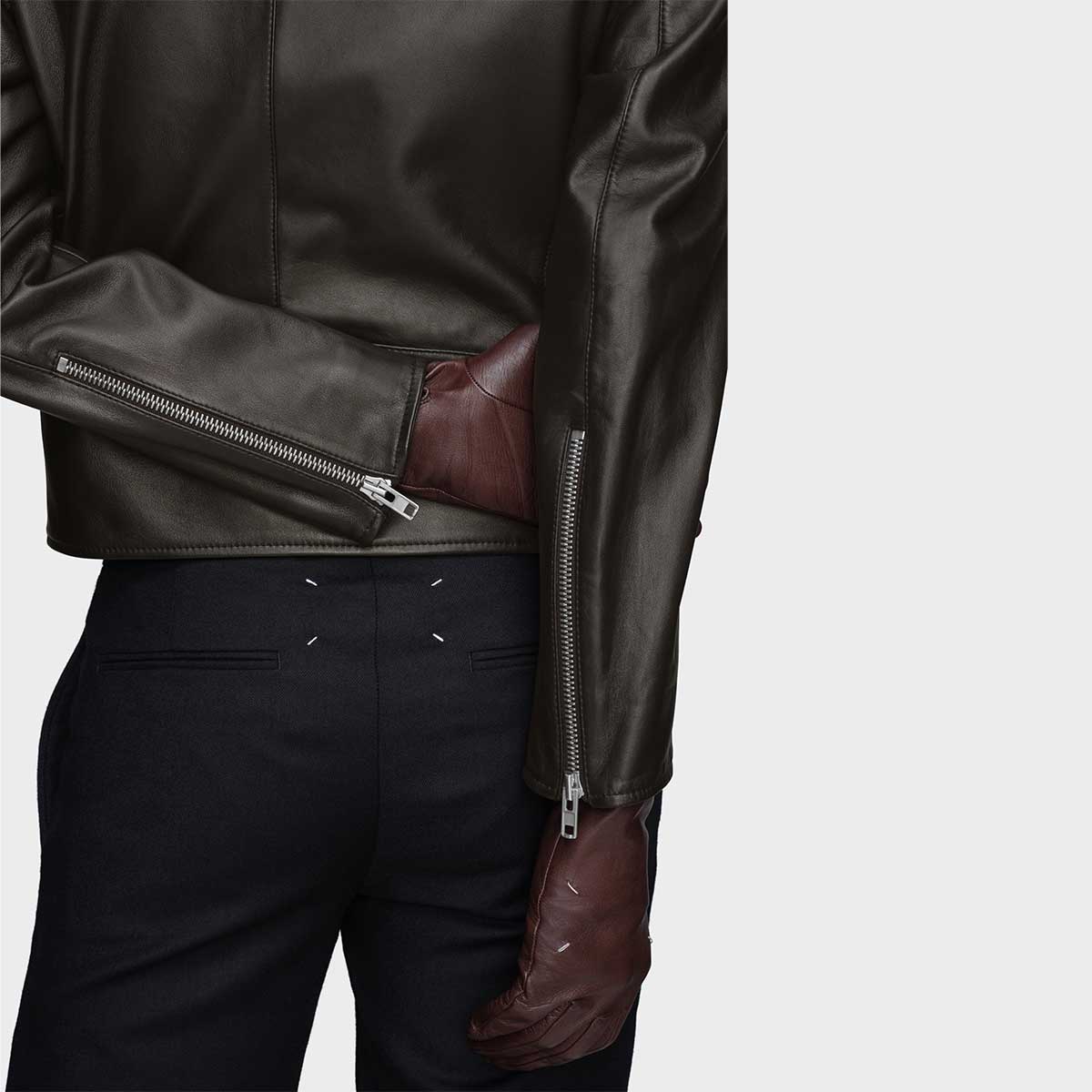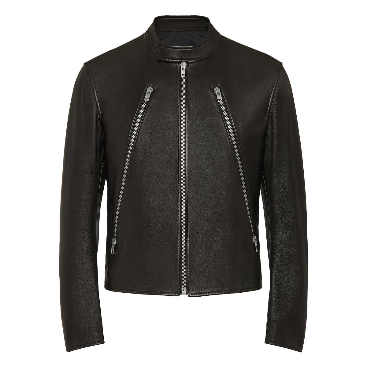 Deconstructing the concept of traditional outerwear, this leather jacket blends functionality with minimalist elegance. Crafted from sleek black leather with a bold exposed zipper, the sharp silhouette and high neckline create a contemporary, rebellious aesthetic.