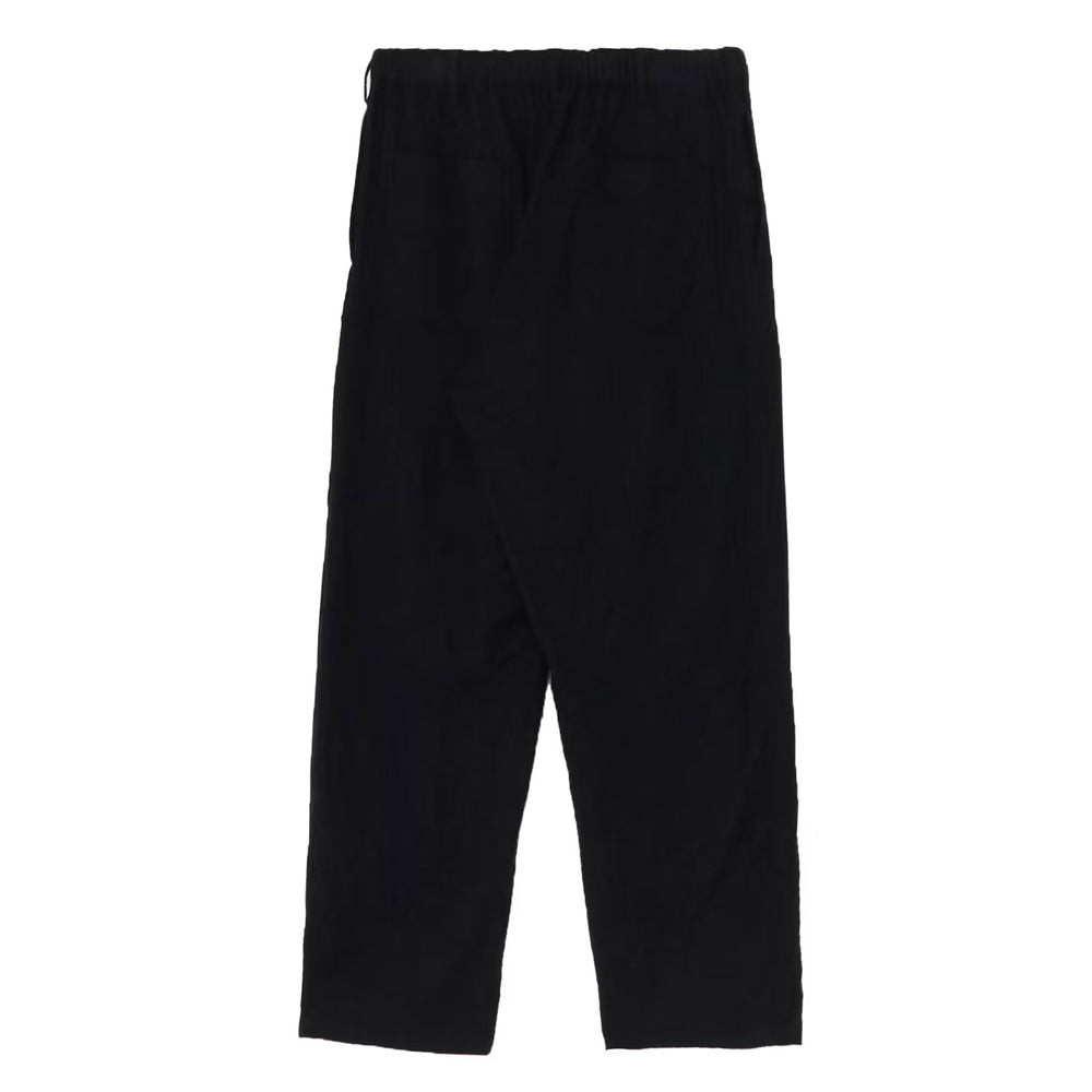 A collaboration item between Y's for men and MASSES. These easy trousers feature a vintage-like silhouette made from felted wool fabric, excellent for creating wrinkles and drapes. The fabric is made from loosely spun wool yarn woven in a gauze-like structure and then felted, resulting in a dense, felt-like surface while maintaining a light and soft touch. With slash pockets on both sides and a patch pocket at the back, and a drawstring at the inside waist, these pants offer a relaxed fit like easy pants.