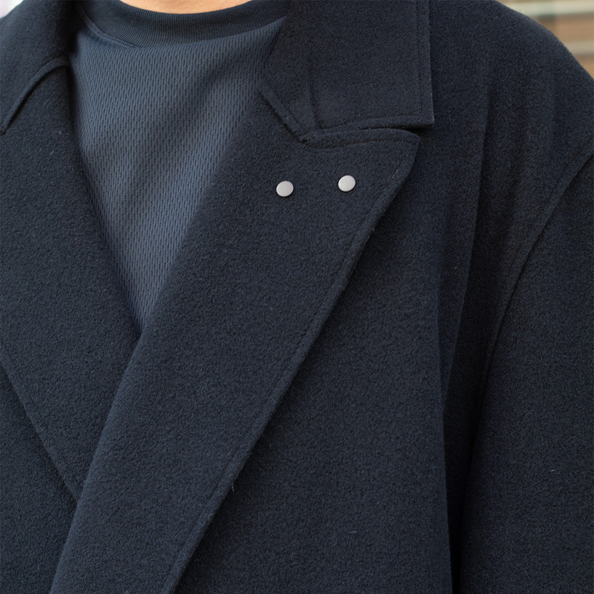 The 'Adonis Cashmere Wrap Coat' is made from a cashmere-wool blend melton fabric, developed to reproduce the weight, texture, and comfort of a blanket. It features a convenient wrap design, secured with two Cobrax buttons at the top and two horn buttons at the waist for a secure fit. Black is a limited-edition color available exclusively at our store.