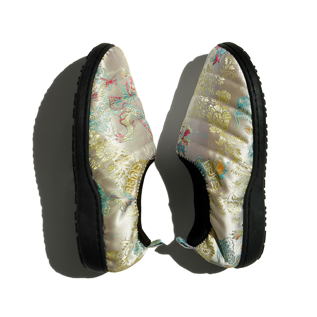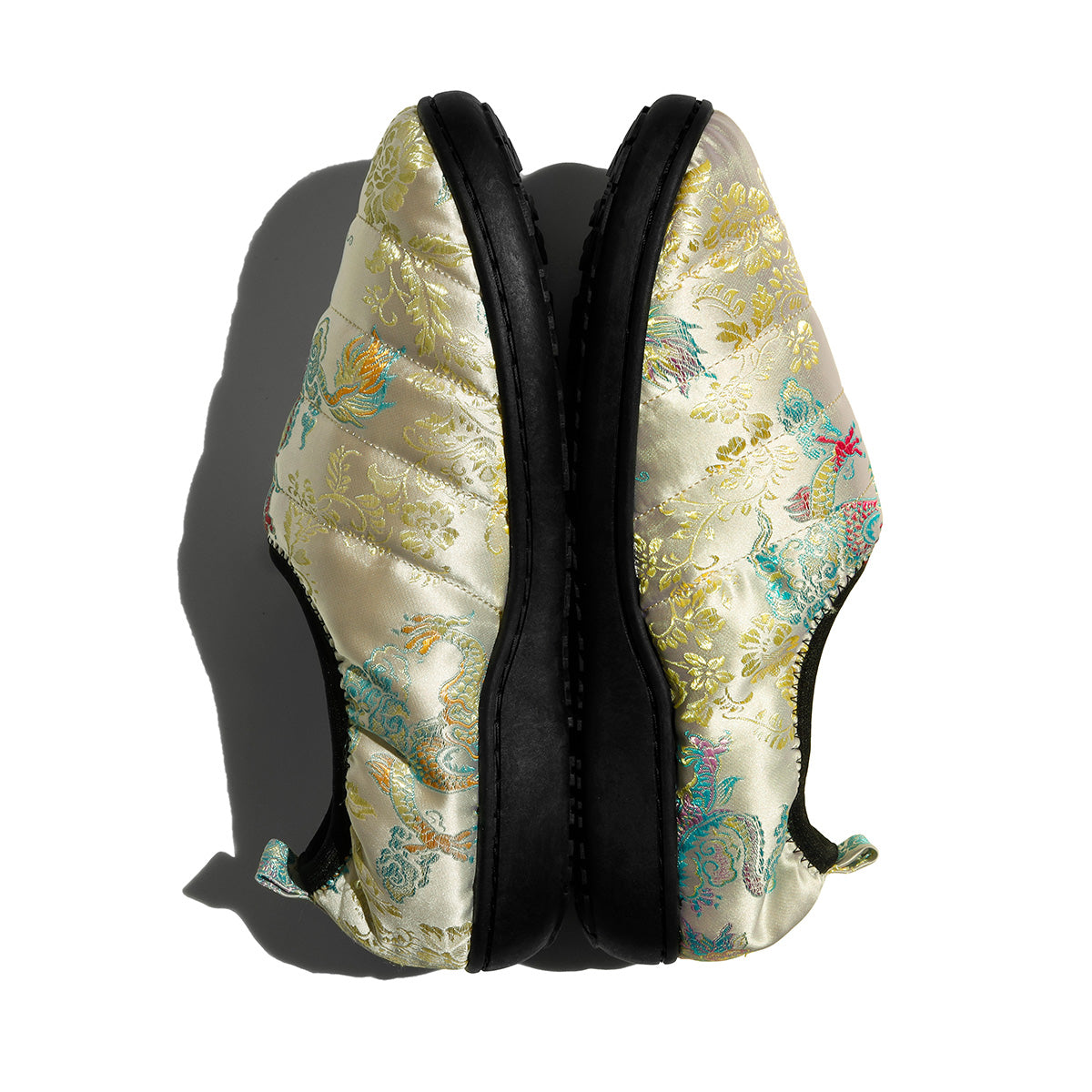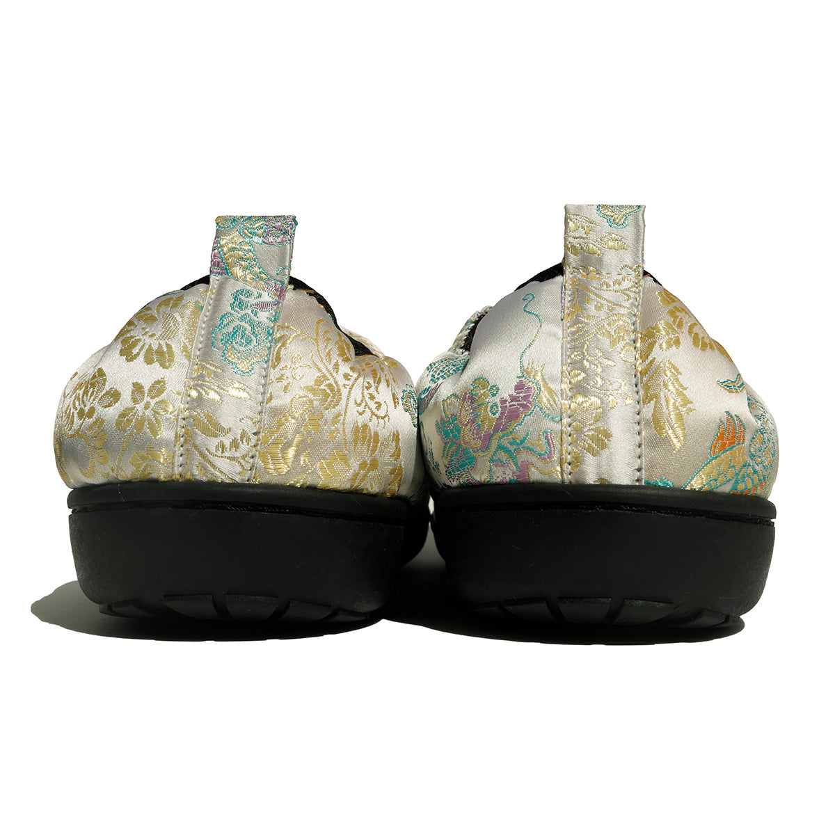 A flamboyant presence blooming in white. The lustrous woven pattern reminiscent of a cheongsam and the design that emerges on the platinum-like base elegantly adorns your feet in winter. Equipped with the newly developed HEXMAX insole, it delivers comfort and a high-rebound feel. While inheriting the DNA of SUBU, it has evolved into a pair of shoes that allows you to enjoy everyday life more freely and comfortably.