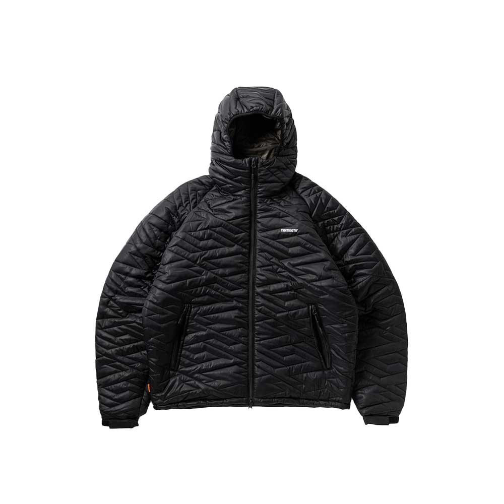 This lightweight and thin hooded down jacket features an original T-pattern quilting. use. It uses a thin, smooth mini ripstop fabric, and the padding is made of Thinsulate™, a functional material with excellent insulating properties. The front opening is a double zipper that can be closed to a high position. This prevents the hood from coming off in the wind and keeps your neck warm. There is also a drawcord at the back of the hood so you can adjust the fit. The front pockets are slash pockets that function as hand warmers and zipper pockets. Double layer design with inner pockets. There are also large, convenient mesh inner pockets on the inside of both sides of the body. Raglan sleeve design with Velcro adjustment straps at the cuffs. The brand logo is printed on the left chest and there is an orange pin label on the seam of the right body. The hem has a drawstring so you can adjust the silhouette. The cord lock and pull handle parts feature the brand logo. There is a hanger loop on the inside of the collar.