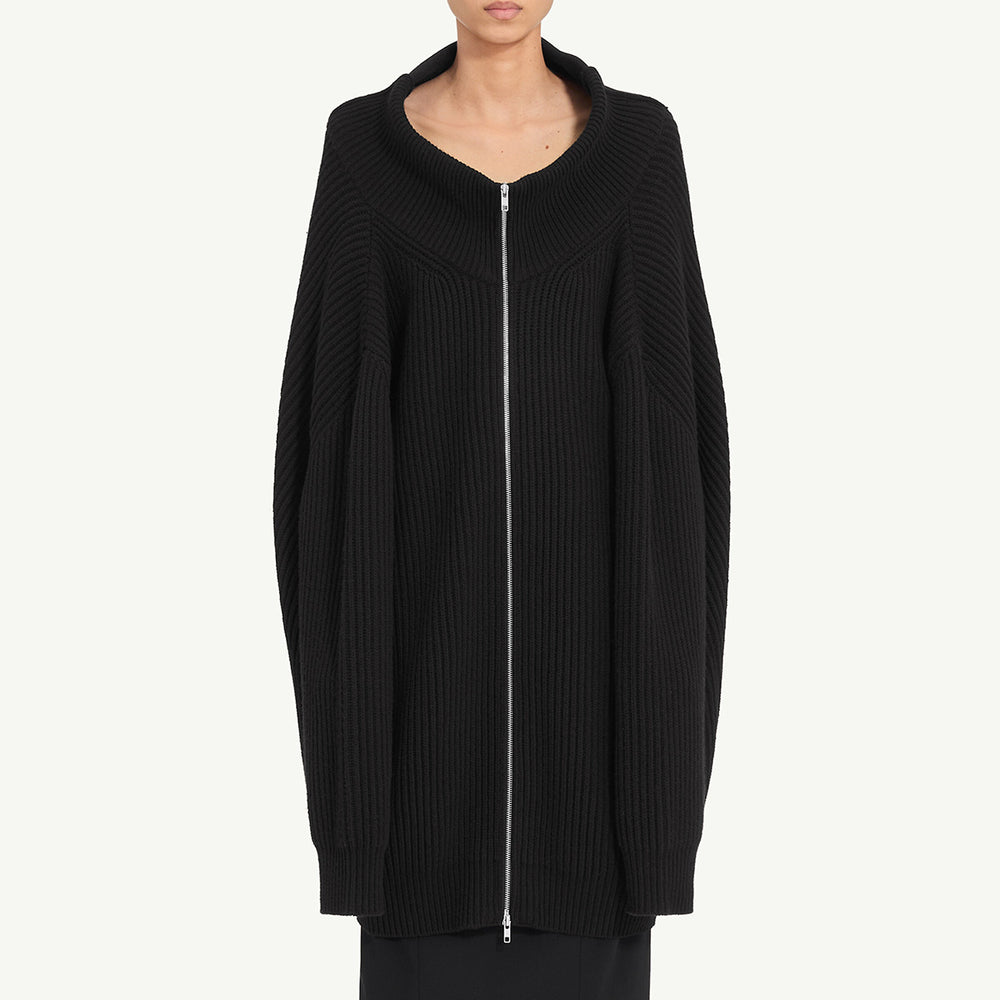 This ribbed knit cardigan dress features a high neck and exaggerated proportions. It has a two-way zipper and long sleeves, and a vertical panel is inserted in the back, allowing you to change the silhouette by opening or closing it. It's a highly versatile piece that can be styled instantly, whether worn as is or with the panel open.
