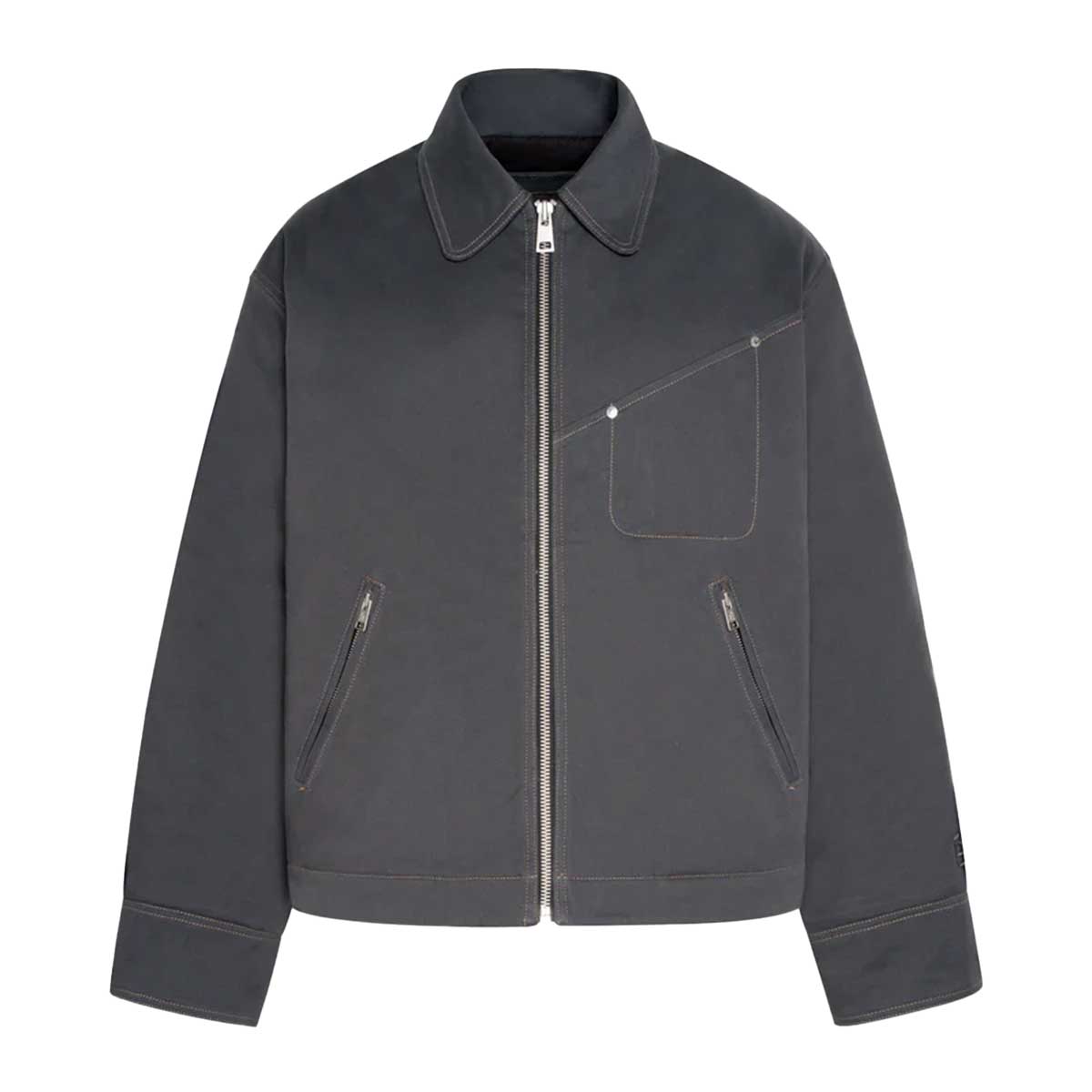 The Boxy zipped jacket is a 100% cotton, long-sleeved, topstitched, slim-fit jacket. It features a classic zip fastening and four pockets: two main zip pockets, one chest pocket, and one internal patch pocket. Études Studio rivets on the side of the chest pocket and adjustable buttons at the back hem add a touch of style. An "É" is embroidered at the bottom of the left sleeve.