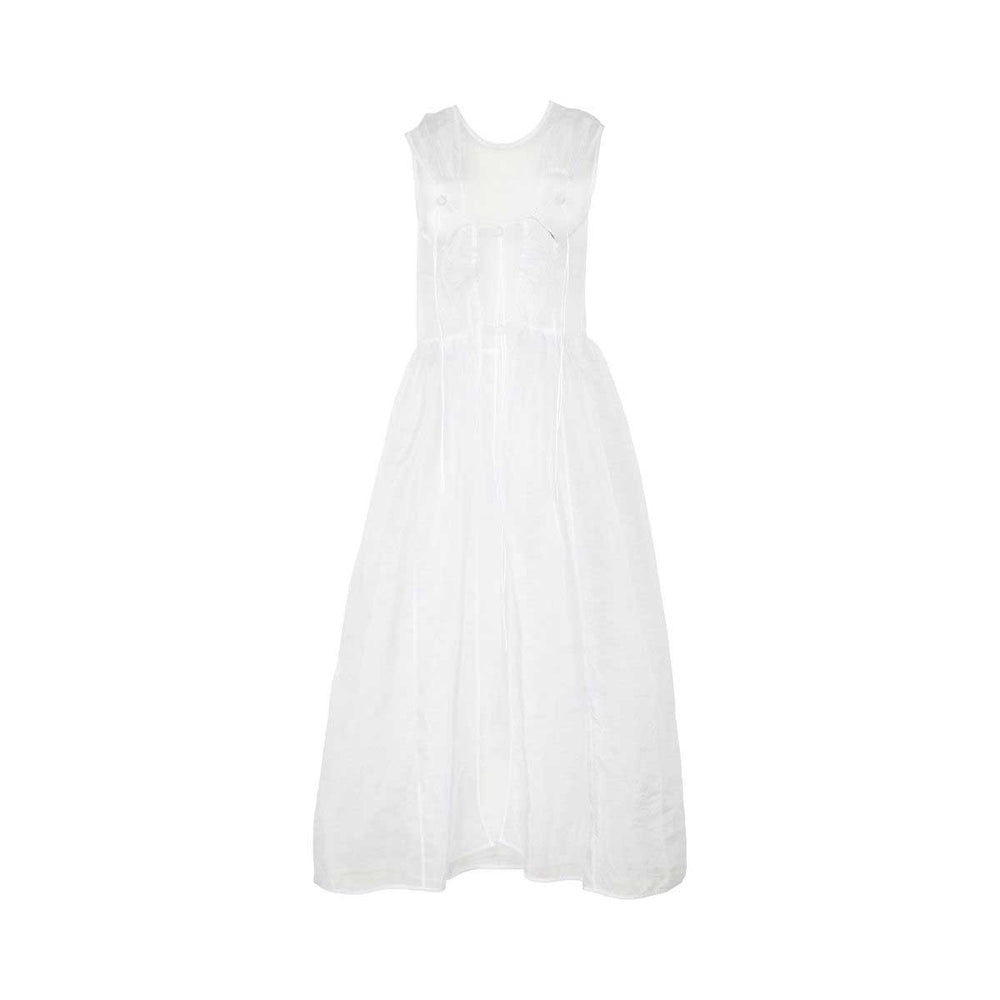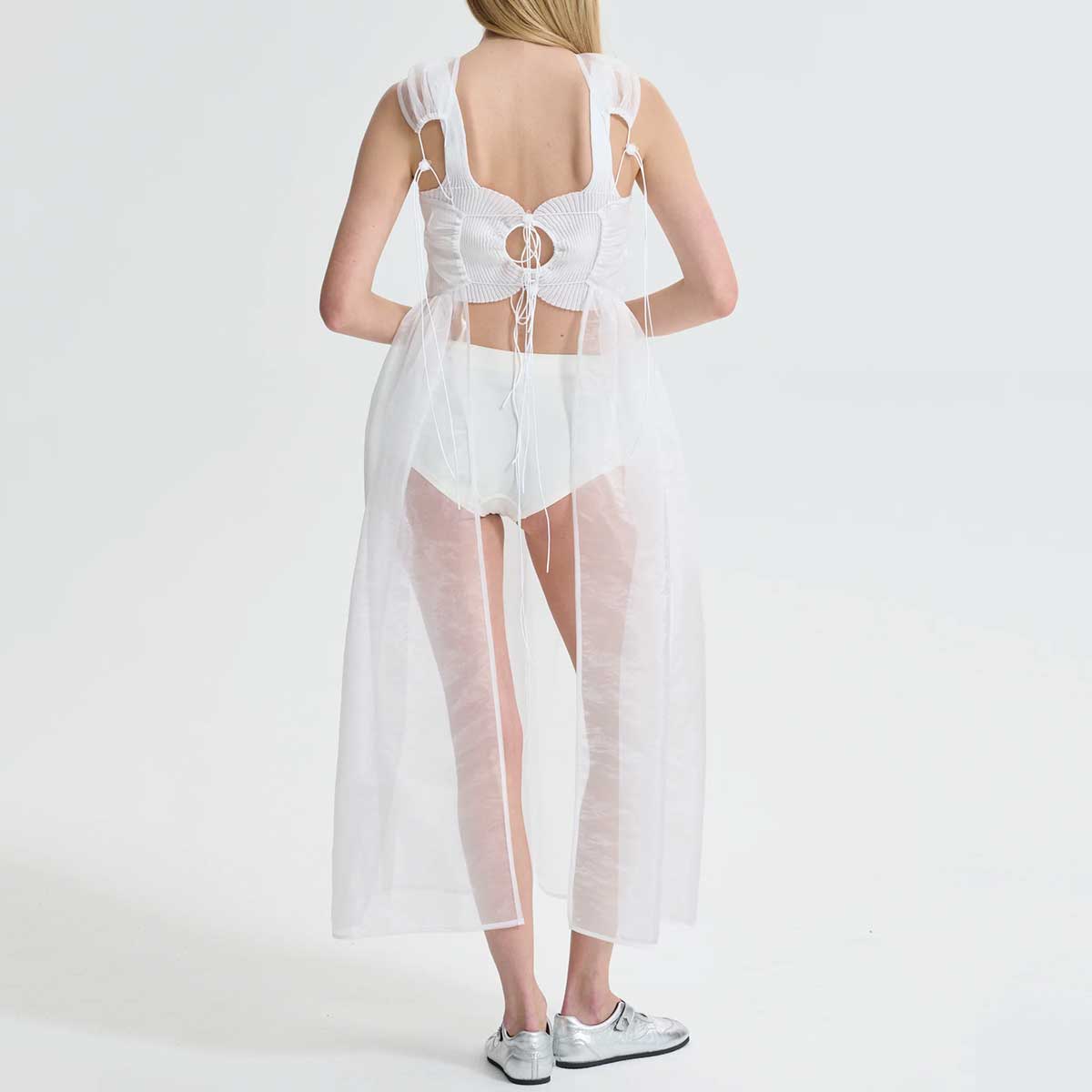 The Chamilia overlay is an elegant design that skillfully combines volume and lightness. The front has a clean, minimalist silhouette, while the structured seam at the waist creates a soft flare, giving the silhouette a light, three-dimensional look. At the back, a floral ribbon loops across the straps, creating a flowing motion and romance with every step.