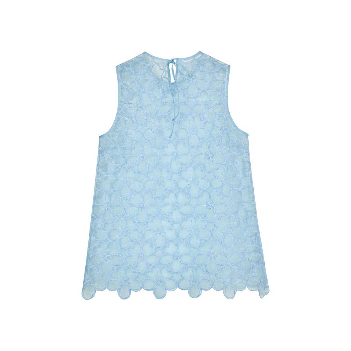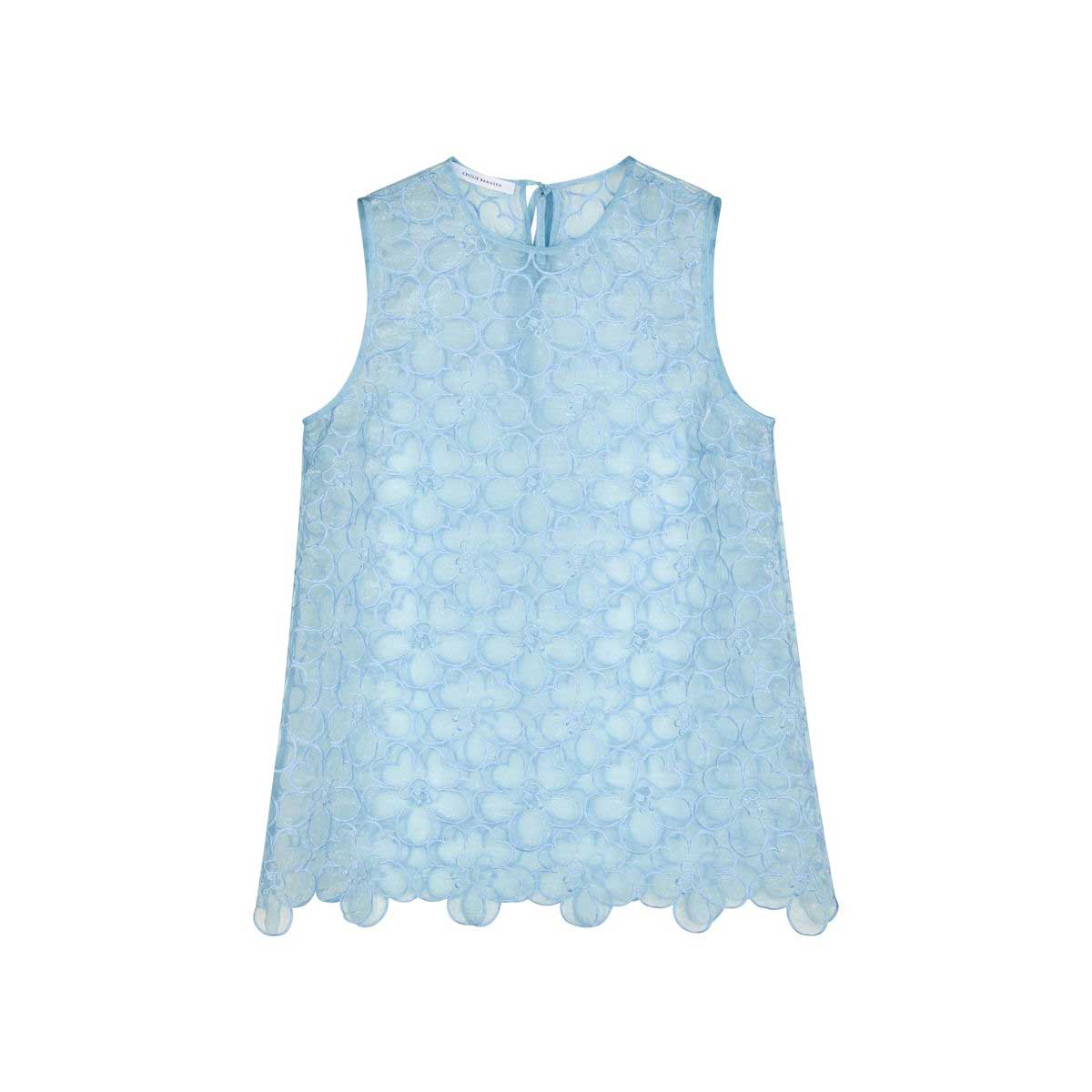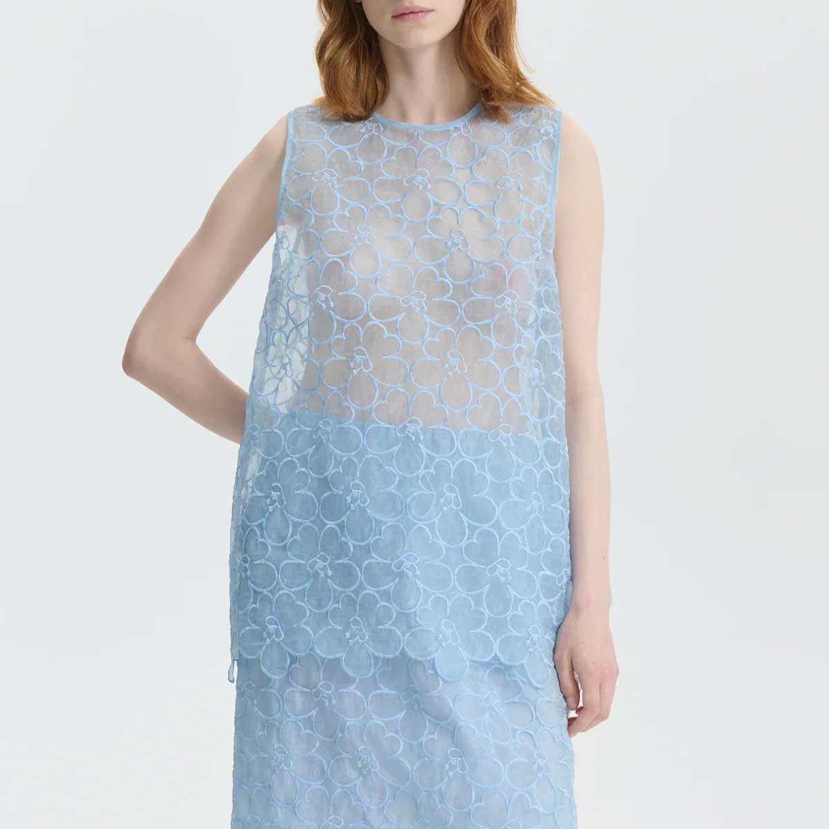 Expressive and poetic, this cherry-colored top is crafted with Felicia embroidery. The unlined design subtly reveals skin behind the floral print. The straight tank silhouette and high neckline create a clean, modern look with delicate, airy details.