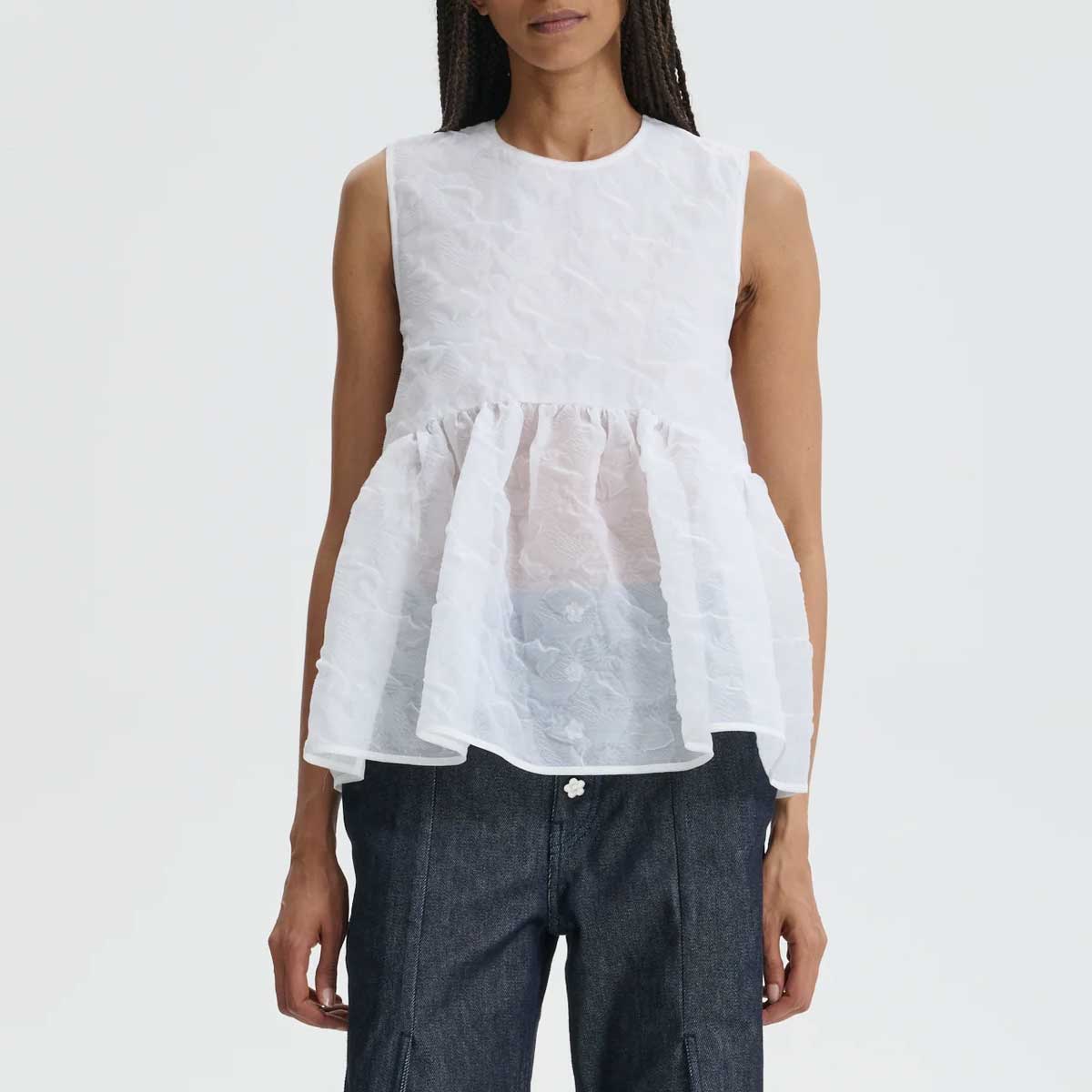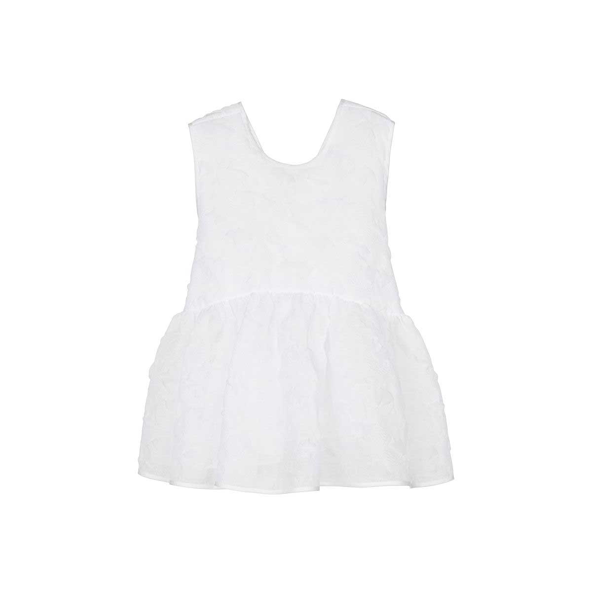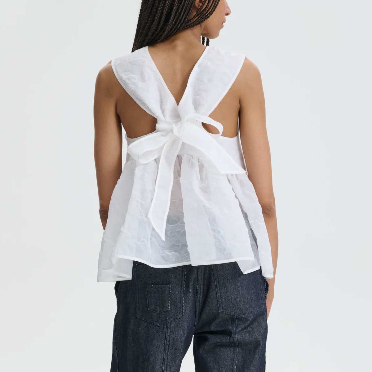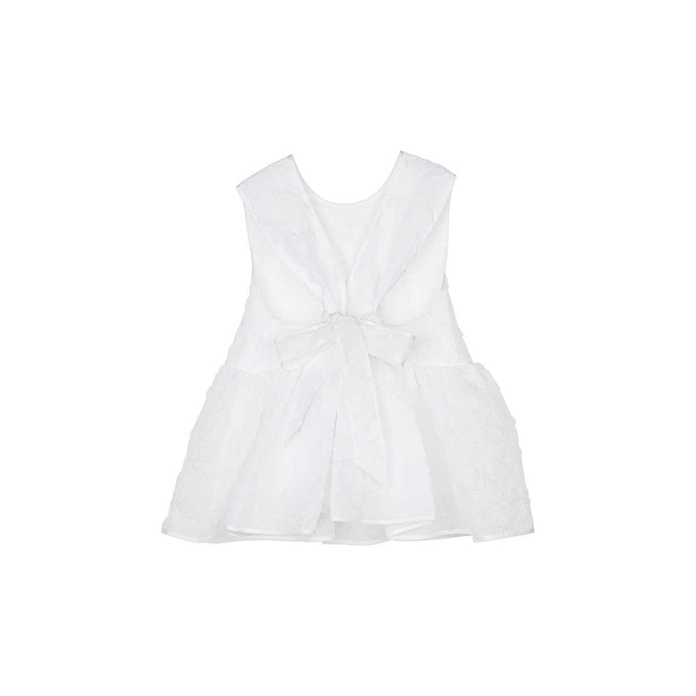 This Grasmere Matelassé Cora top is a masterpiece of volume and detail. The babydoll silhouette flows into a soft peplum, while the high neckline elegantly accentuates the shoulders. Cross ribbons fasten the bodice at the back, creating a delicate and romantic finish that is typical of Cecilie Bahnsen.