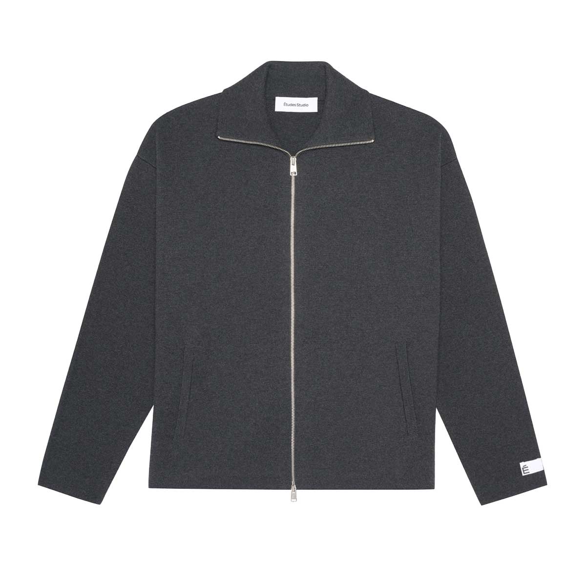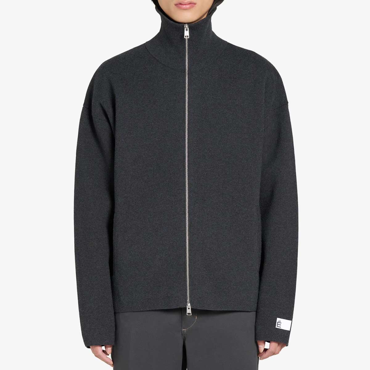 The Milano zip cardigan is a long-sleeved vest made from a cotton and merino wool blend. It features a lapel collar, a front zip, two front pockets, and an É label on the left sleeve.