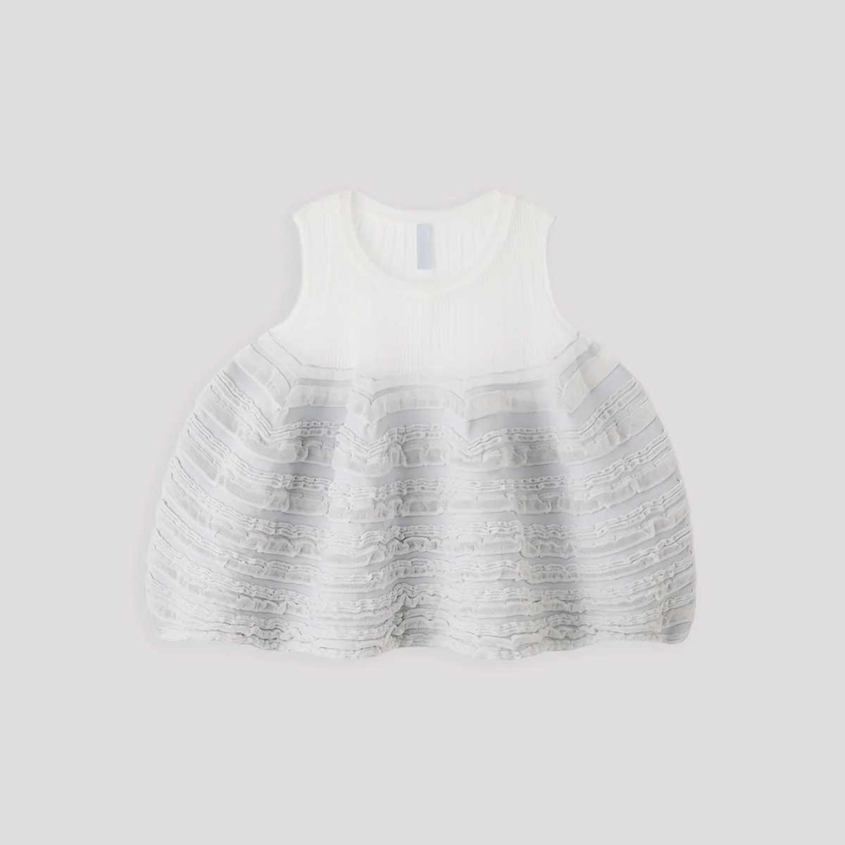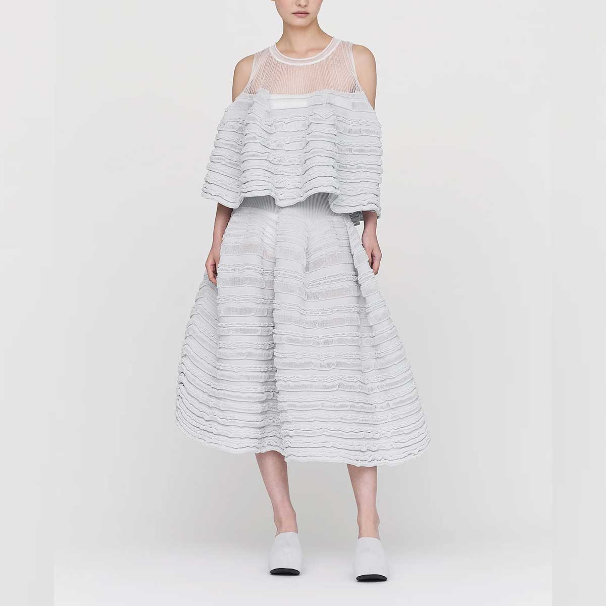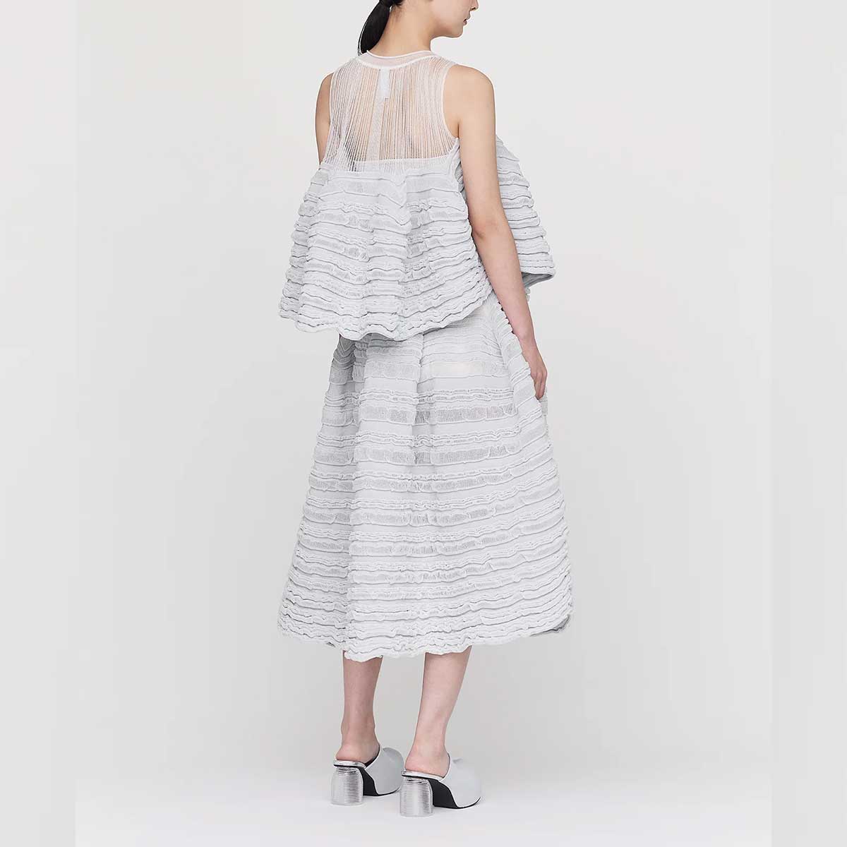 This top is part of CFCL's iconic POTTERY series. Its unique knit fabric, which spreads from the underbust and expresses complex contours and a sense of depth and transparency, is striking. It's highly elastic, swaying rhythmically with every step. It has no seams, making it extremely comfortable to wear.