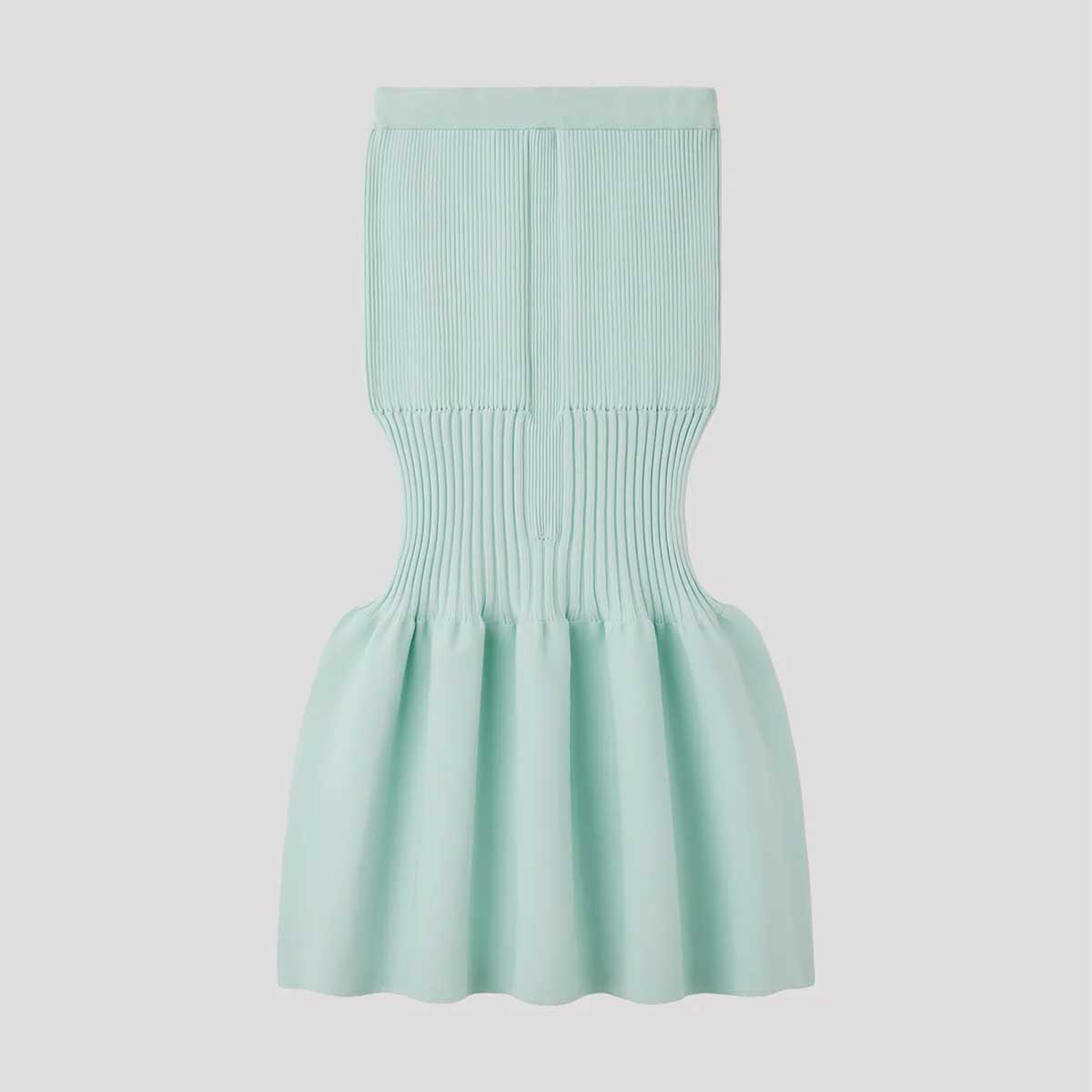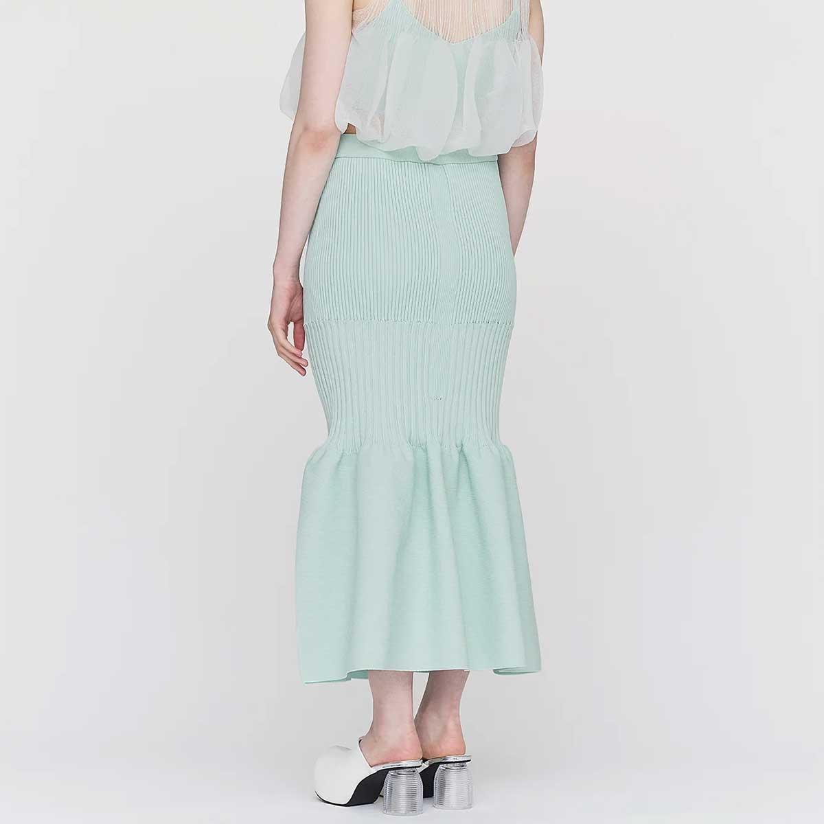 CFCLを象徴するFLUTEDシリーズのマーメードスカート。ストレッチ性の異なる2種類のリブを交互に編むことでユニークなシルエットを生み出しています。日常から楽に着用できる紐付きのゴムウエスト仕様です。ウエストからヒップにかけてはタイトフィットなのに対し、裾はガーター編みのためふんわりと身体から離れ、マーメイドのようなシルエットを演出します。
