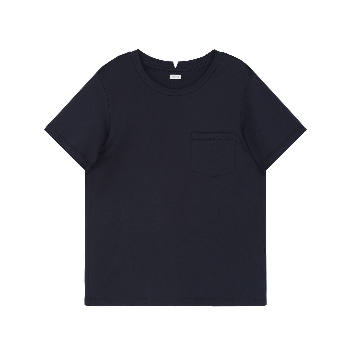 リブ仕様のクルーネック、フロント胸元のパッチポケット、センターカラーのスリット、そして背面のディテールが特徴です。