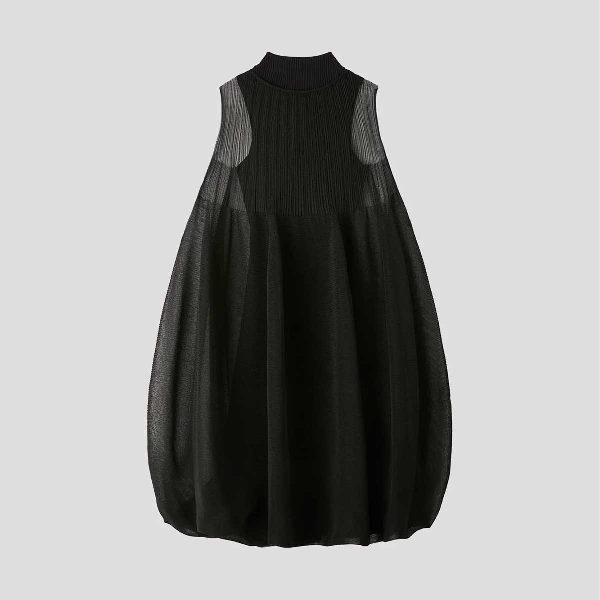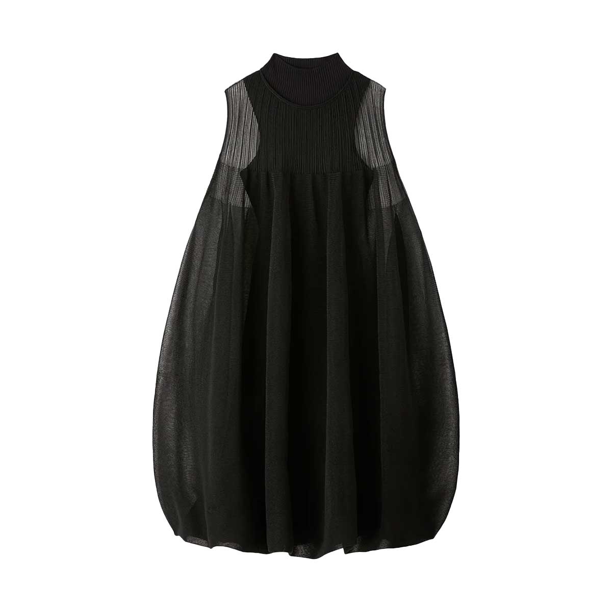 CFCLを象徴するPOTTERYを、透明感のある軽やかな素材で表現したスリーブレスドレス。内側をタイトフィットにすることで、レイヤードされたフレアが立体的で美しいバルーンシルエットを生み出します。縫い代がなく、ストレッチ性に優れ、快適な着心地です。