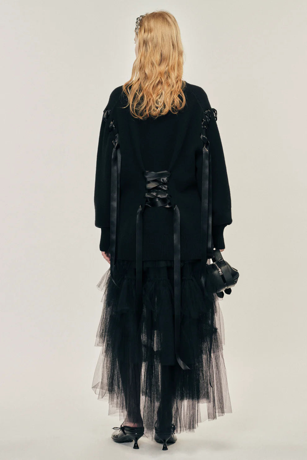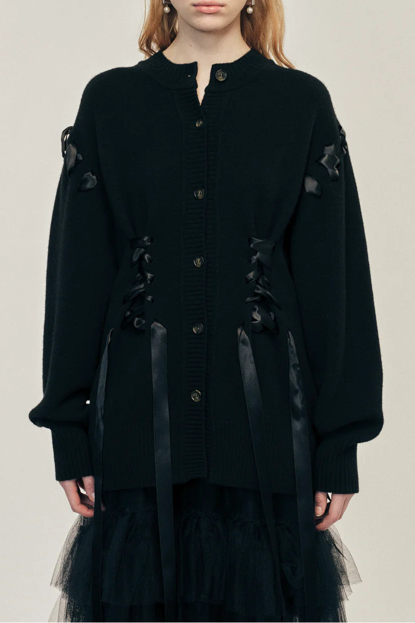 コルセット風のデザインで、全体にサテンリボンのディテールが施されたカーディガンです。ボリュームのある袖とオーバーサイズのシルエットが、リボンのレースでドラマチックな立体感を演出します。
